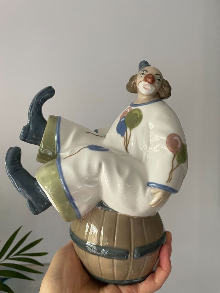 Редкая большая фигурка клоуна, сидящего на бочке. Статуэтка создана в Испании во второй половине 20 века из костяного фарфора. Разукрашена вручную. Оформлена в спокойных природных оттенках цветов. Выполнена аккуратно и детализировано. Сохранилась в прекрасном состоянии, без сколов и трещин. Станет интересным элементом интерьера или частью коллекции. Высота 20см. Все лоты выставлены на нескольких площадках поэтому, пожалуйста, перед покупкой уточняйте наличие.