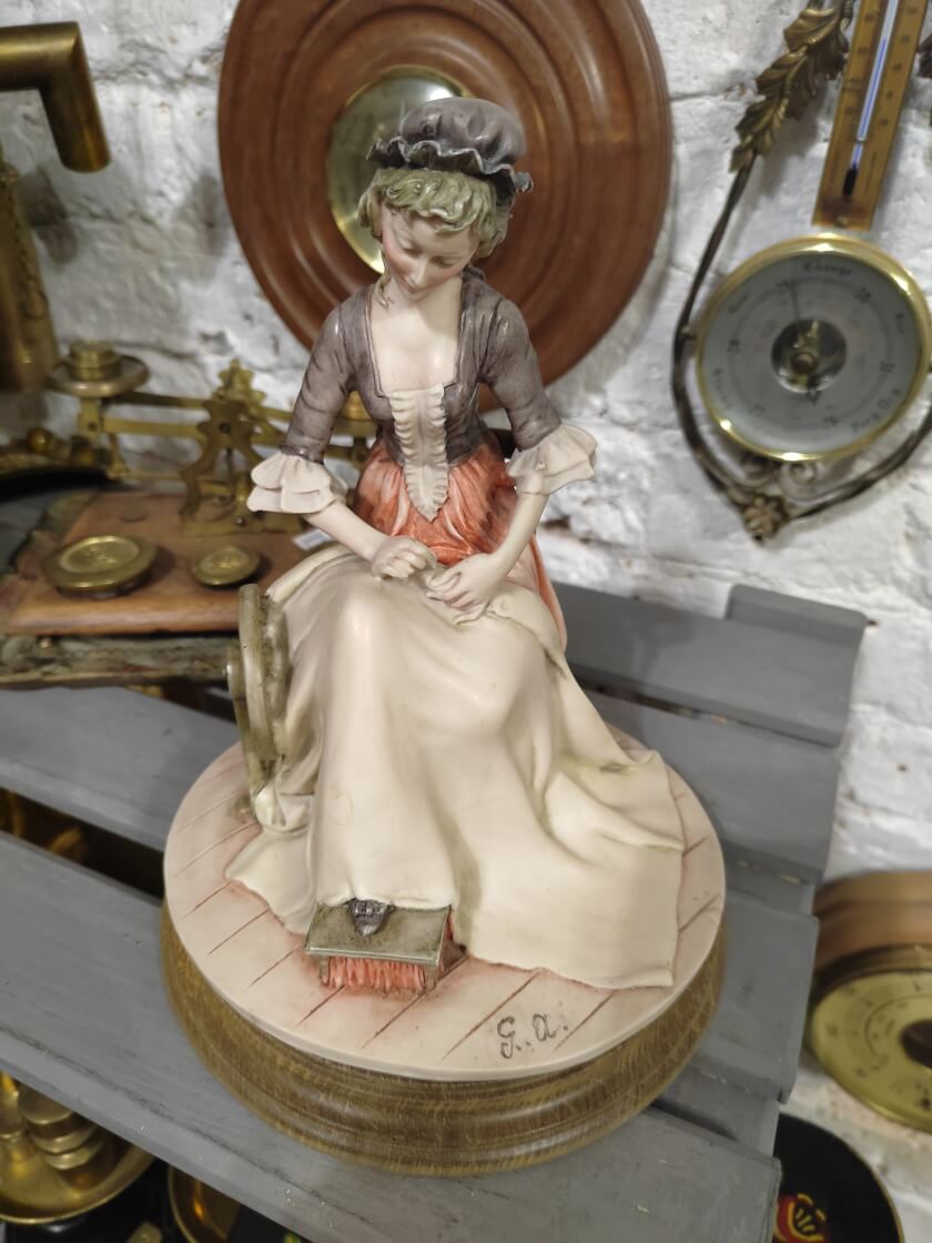 Винтажная статуэтка девушки-швеи с вышивкой в руках. Создана в Италии в середине 20 века. Произведена из бисквитного костяного фарфора. Оформлена в нежных пастельных тонах. Изготовлена и раскрашена вручную. Стоит подпись художника. Фигурка размещения на деревянном основании. Сохранилась в прекрасном состоянии, без сколов и трещин. Станет интересным элементом декора интерьера или частью коллекции. Все лоты выставлены на нескольких площадках поэтому, пожалуйста, перед покупкой уточняйте наличие.