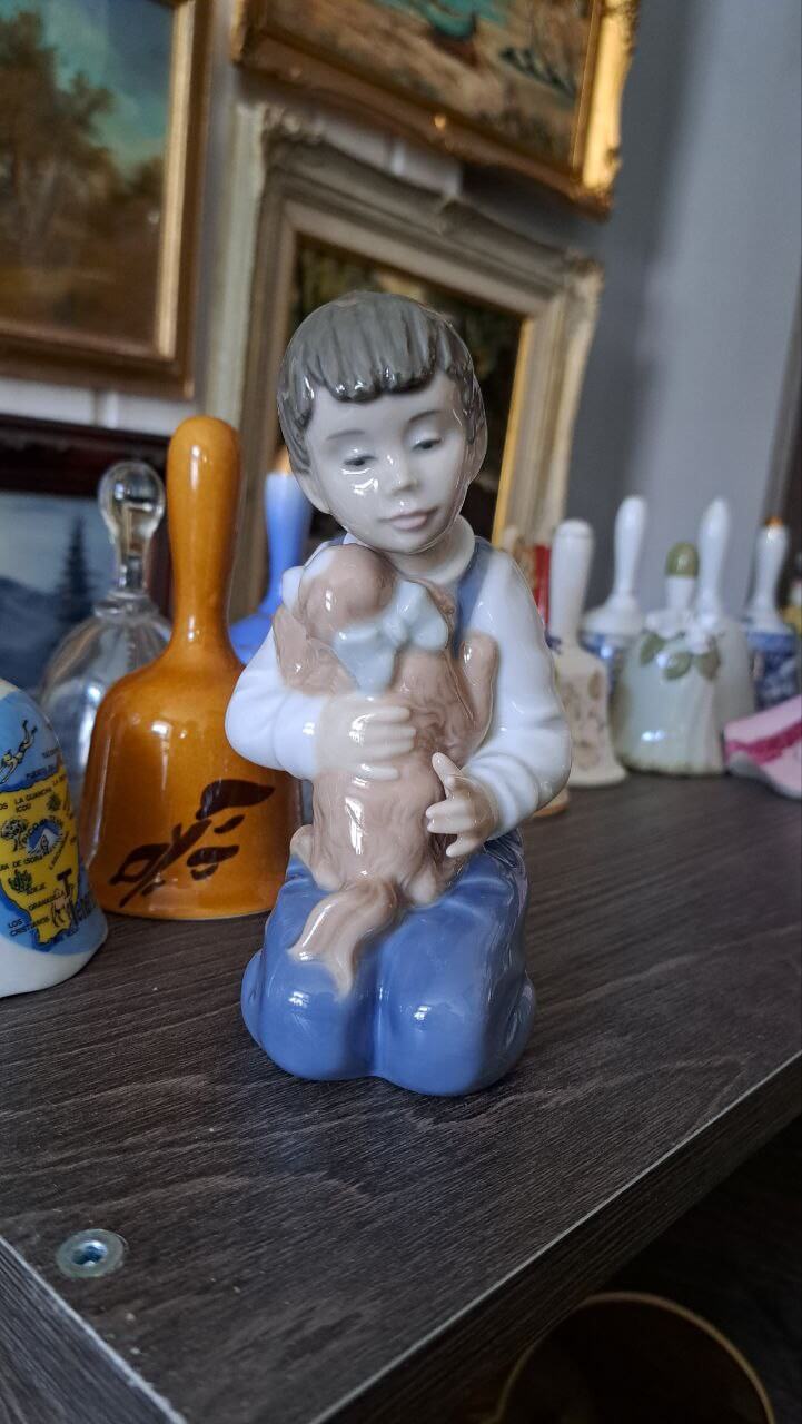 Винтажная фарфоровая статуэтка мальчика со щенком. Произведена фирмой Nao Lladro в Испании в 1990 году. Выполнена в белом, бежевом и голубом цветах. Создана и разукрашена вручную. Стоят клейма от производителя. Изделия Nao считаются лучшими от производителя Lladro, эти фигурки отличаются особой тонкостью и изяществом. Статуэтка в прекрасном состоянии, без сколов и трещин, станет интересным элементом декора или хорошим подарком для коллекционера. Все лоты выставлены на нескольких площадках поэтому, пожалуйста, перед покупкой уточняйте наличие.