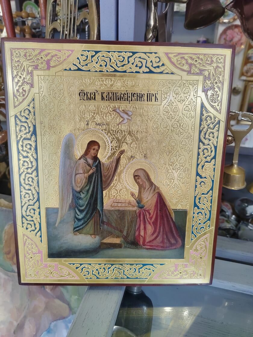 Антикварная икона с сюжетом «Благовещение Пресвятой Богородицы». Изображает библейскую сцену дня, когда архангелом Гавриилом была сообщена радостная весть Деве Марии о том, что в скором времени у неё появится ребенок, который навсегда заменит престол Давида, и окажется для людей спасителем всего мира. Именно это событие и изображено на иконе Благовещения Пресвятой Богородицы. Икона в хорошем состоянии. Все лоты выставлены на нескольких площадках поэтому, пожалуйста, перед покупкой уточняйте наличие.