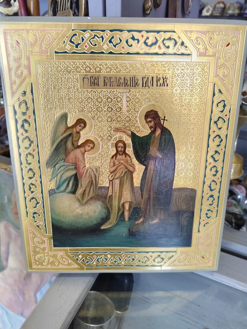 Старинная икона с сюжетом «Богоявление Господа Иисуса Христа» или «Крещение Господне». На иконе изображен евангельский сюжет, визуализирующий крещение Иисуса Христа в Иордане. Согласно Священному Писанию, Спаситель явился к Иоанну Предтече и попросил покрестить его. И когда Иоанн начал обряд крещения, на Иисуса снизошел Святой Дух в виде голубя, а с небес раздался голос Бога-отца, благословившего Сына на подвиг во спасение человечества. Икона в хорошем состоянии. Все лоты выставлены на нескольких площадках поэтому, пожалуйста, перед покупкой уточняйте наличие.