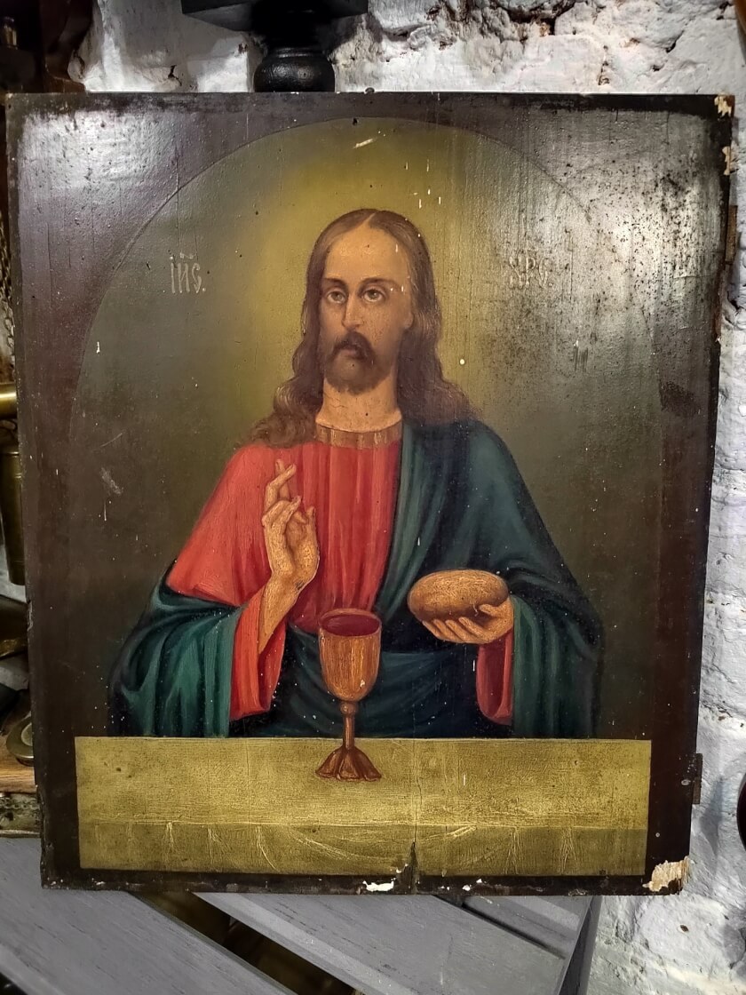 Старинная икона с сюжетом «Спас Вседержитель, благословляющий хлеб и вино». Образ Иисуса Христа с хлебом и кубком с вином. Встречается достаточно редко. Икона представляет Иисуса во время Тайной Вечери, благословляющего хлеб и вино и устанавливающего Таинство Евхаристии. Образу молятся об избежании бедности, на семейное и финансовое благополучие. Икона в прекрасном состоянии. Все лоты выставлены на нескольких площадках поэтому, пожалуйста, перед покупкой уточняйте наличие.