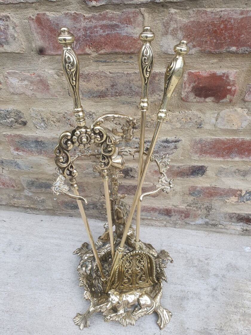 Функциональный старинный набор для камина. Создан в конце 19 века в Англии. Произведен из тяжёлой латуни. Оформлен в Викторианском стиле с изящными, витиеватыми и закругленными формами. Включает в себя: кочергу, щипцы, лопату и подставку-держатель для инструментов. Подставка украшена в охотничьей тематике. Прочные изделия помогут содержать камин в чистоте и станут прекрасным дополнением интерьера. Старинные приборы привнесут в помещение античности и будут служить долгие годы. Высота 84см. Все лоты выставлены на нескольких площадках поэтому, пожалуйста, перед покупкой уточняйте наличие.