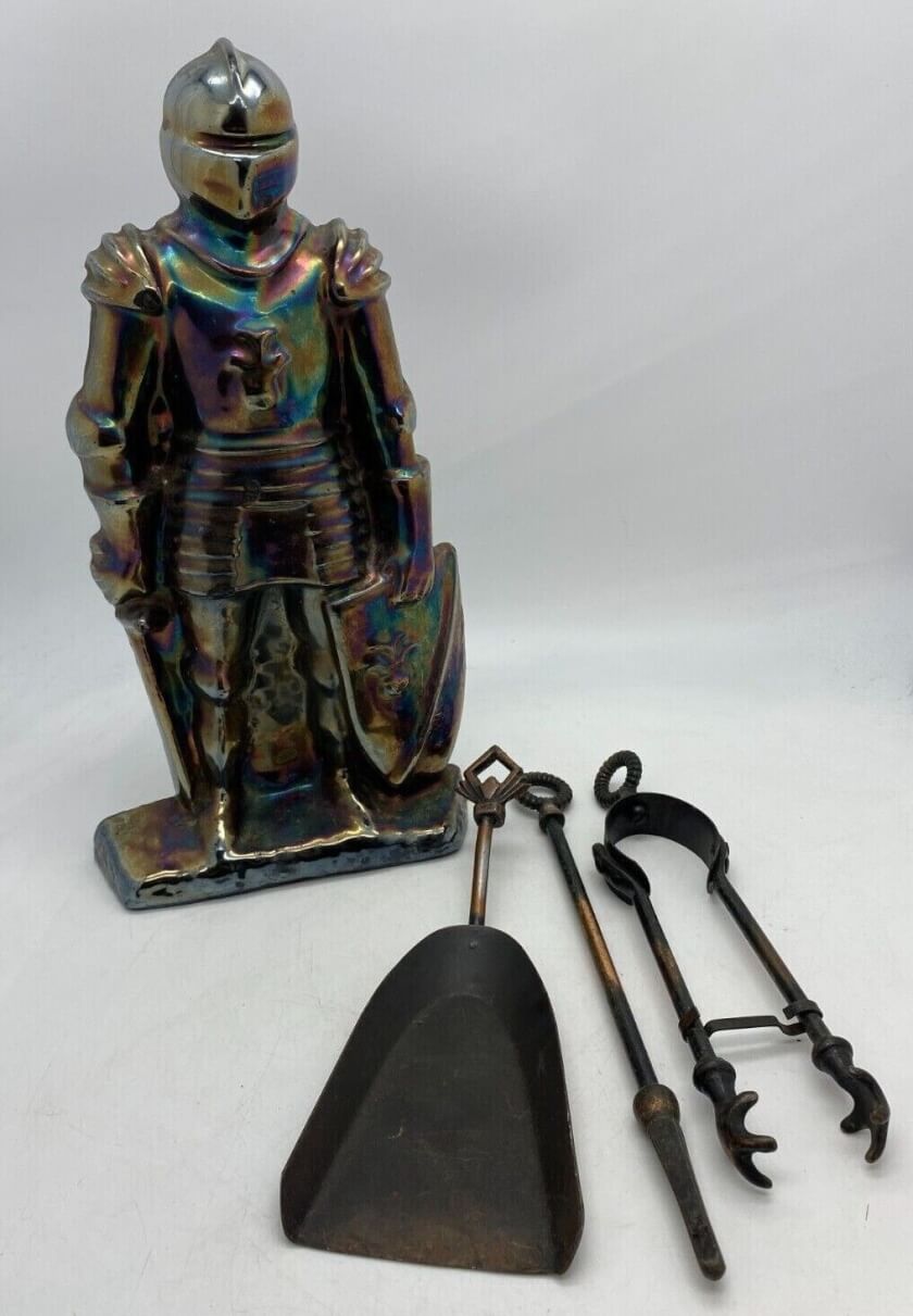 Функциональный винтажный набор для камина. Создан в середине 20 века в Англии. Произведен из чугуна. Идёт в комплекте с держателем в виде фигуры средневекового рыцаря. Включает в себя: кочергу, щипцы и лопату. Прочные изделия помогут содержать камин в чистоте и станут прекрасным дополнением интерьера. Антикварные приборы привнесут в помещение античности и будут служить долгие годы. Все лоты выставлены на нескольких площадках поэтому, пожалуйста, перед покупкой уточняйте наличие.
