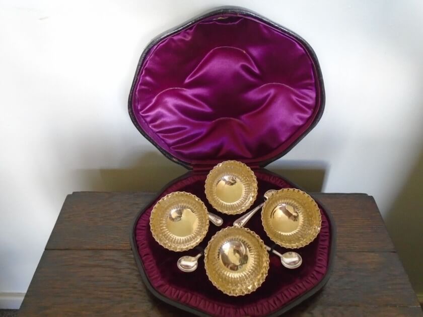 Старинный набор из 4 икорниц / солонок с оригинальными родными ложками в комплекте. Созданы из стерлингового серебра, покрыты золочением. Произведены в Лондоне, Англия в 1885 году на мануфактуре Aldwinckle & Slater. Лежат в родной коробке на малиновом бархате. Стоят клейма от производителя. Могут использоваться для хранения соли и специй, подачи икры и морепродуктов. Станут восхитительным элементом сервировки стола или статусным подарком для ценителя серебра. Все лоты выставлены на нескольких площадках поэтому, пожалуйста, перед покупкой уточняйте наличие.
