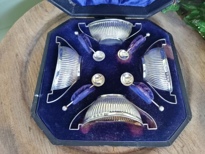 Восхитительный старинный набор из 4 солонок/сахарниц и 4 ложек. Комплект оформлен в Викторианском стиле, создан из стерлингового серебра, произведен в Бирмингеме, Англия, на мануфактуре Уильяма Девенпорта в 1899 году. Стоят клейма от производителя. Набор лежит в родном кейсе на синем бархате с ячейками. Чаши и ложки сохранились в прекрасном состоянии. Могут использоваться как икорницы. Станут восхитительным элементом кухонного интерьера и сервировки стола. Все лоты выставлены на нескольких площадках поэтому, пожалуйста, перед покупкой уточняйте наличие.
