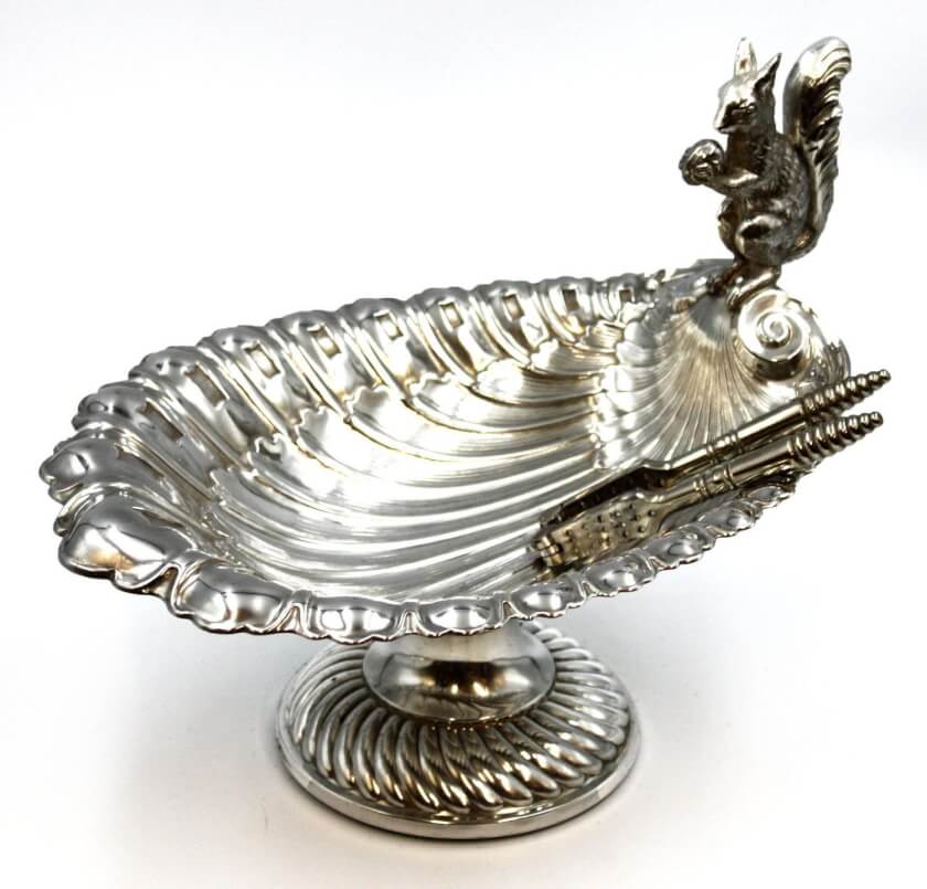 Винтажное сервировочное блюдо на подставке. Создано в Англии в 1910-х годах, покрыто стойким серебрением. Основная часть оформлена в виде глубокой раковины, которая стоит на ножке, и украшена объемной фигуркой белки. Блюдо идёт в комплекте с парой старинных посеребренных “щелкунчиков” для орехов. Может использоваться при сервировке стола для подачи орехов, закусок, сладостей, канапе. Станет восхитительным элементом декора кухонного интерьера. Ширина 27см. Все лоты выставлены на нескольких площадках поэтому, пожалуйста, перед покупкой уточняйте наличие.
