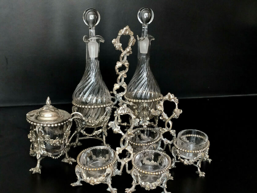 Антикварный набор из 7 элементов для специй и соусов. Включает в себя: сахарницу с крышкой, 4 солонки и перечницы, 2 соусника. Все составляющие комплекта стоят на индивидуальных посеребренных подставках, украшенных птичьими лапами и объёмными изображениями цветов. Круэт создан в Англии в середине 20 века. Покрыт стойким серебрением. Сохранился в прекрасном состоянии, может использоваться в быту. Станет великолепным, функциональным элементом кухонного декора или интересным подарком. Все лоты выставлены на нескольких площадках поэтому, пожалуйста, перед покупкой уточняйте наличие.