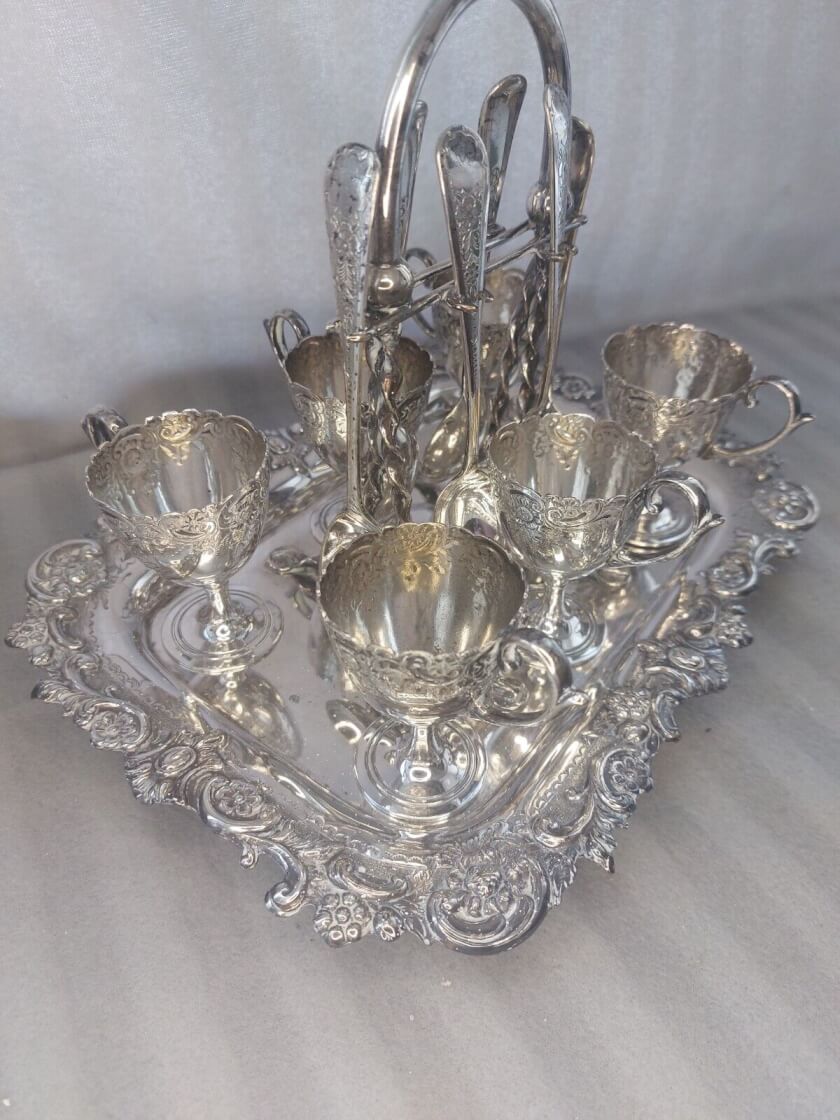 Изысканный круэт на 6 персон. Набор для приготовления и подачи к столу яиц всмятку на изящной подставке. Создан в середине 20 века в Англии на мануфактуре Joseph Rodgers & sons. Покрыт стойким серебрением. Украшен объёмными цветочными узорами. Пашотницы идут в комплекте с родными ложечками и подставкой. Круэт имеет округлую ручку для удобства использования, переноса и подачи к столу комплекта пашотниц. Прекрасно подойдёт для семейного завтрака. Все лоты выставлены на нескольких площадках поэтому, пожалуйста, перед покупкой уточняйте наличие.