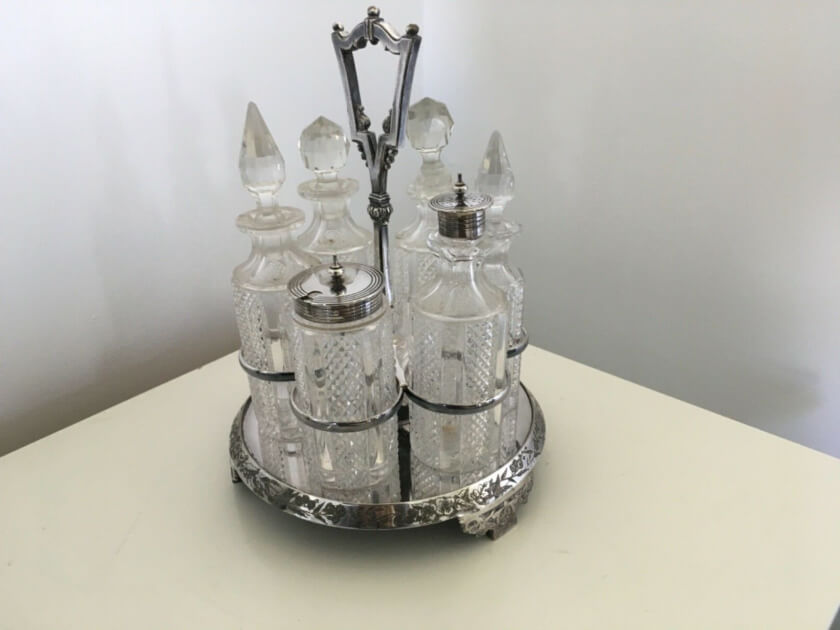 Антикварный круэт для специй включает в себя 6 предметов на родной подставке. Состоит из солонки, сахарницы и четырех соусниц. Подставка снабжена ручкой для удобства использования и переноса, стоит на небольших ножках. Круэт создан в Англии в начале 20 века. Произведен из хрусталя, на металлические части нанесено стойкое серебрение. Оформлен в Викторианском стиле. Сохранился в хорошем состоянии. Может активно использоваться в быту по назначению. Станет интересным элементом декора кухонного интерьера. Все лоты выставлены на нескольких площадках поэтому, пожалуйста, перед покупкой уточняйте наличие.