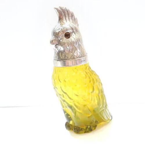 Великолепный графин в форме попугая. Корпус создан из стекла ярко-желтого цвета. Голова покрыта стойким серебрением, глаза произведены из стекла. На ободке шеи стоят клейма от производителя. Изделие выполнено утончённым и детализированным. Графин / кувшин в прекрасном состоянии, без сколов и трещин. Может активно использоваться в быту по назначению. Станет ярким и интересным элементом интерьера. Размер: 27см × 12см. Все лоты выставлены на нескольких площадках поэтому, пожалуйста, перед покупкой уточняйте наличие.