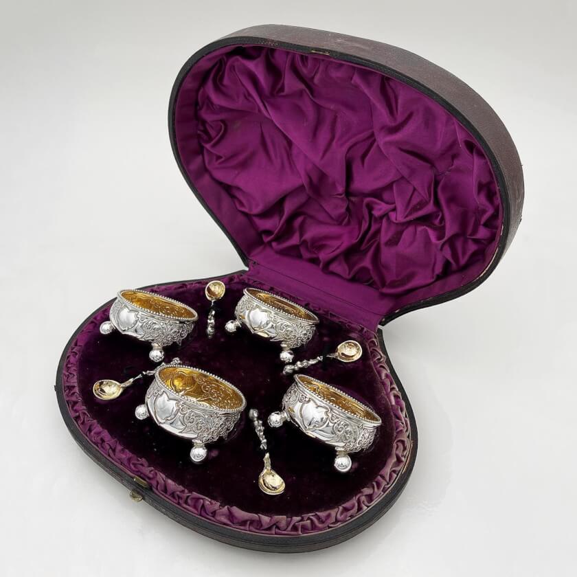 Превосходный набор из 4 старинных формочек и 4 ложек. Комплект оформлен в Викторианском стиле, создан из стерлингового серебра, внутри покрыт золочением, произведен в Шеффилде, Англия, на мануфактуре Hall&Co в 1884 году. Стоят клейма от производителя. Набор лежит в родном кейсе на фиолетовом бархате с ячейками. Чаши и ложки сохранились в прекрасном состоянии, не были в использовании. Украшены объёмными витиеватыми узорами. Станут восхитительным элементом декора кухонного интерьера, сервировки стола или интересным подарком для ценителя антикварного серебра. Все лоты выставлены на нескольких площадках поэтому, пожалуйста, перед покупкой уточняйте наличие.
