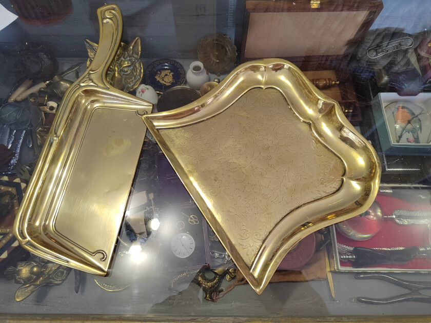 Винтажный набор для уборки, состоящий из лопатки и совка. Инструменты созданы в Англии в первой половине 20 века. Изготовлены из латуни, украшены резными цветочными узорами. Набор многофункциональный: может использоваться для уборки на столе, полках, мебели, полу. Комплект в прекрасном состоянии, удобен и незаменим в быту. Все лоты выставлены на нескольких площадках поэтому, пожалуйста, перед покупкой уточняйте наличие.