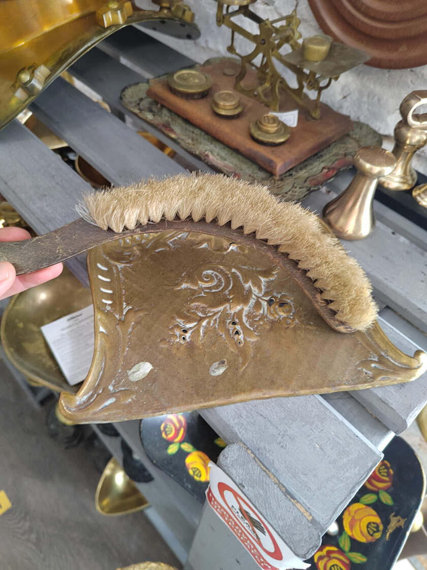 Винтажный комплект для уборки на столе и поверхностях. Создан в Англии в первой половине 20 века. Состоит из совка и щетки. Ворс щетки из натурального лошадиного волоса, основание – дерево. Совок произведен из латуни, украшен объемным лиственным узором. Набор сохранился в хорошем винтажном состоянии. Может использоваться в быту по назначению или в декоративных целях. Все лоты выставлены на нескольких площадках поэтому, пожалуйста, перед покупкой уточняйте наличие.