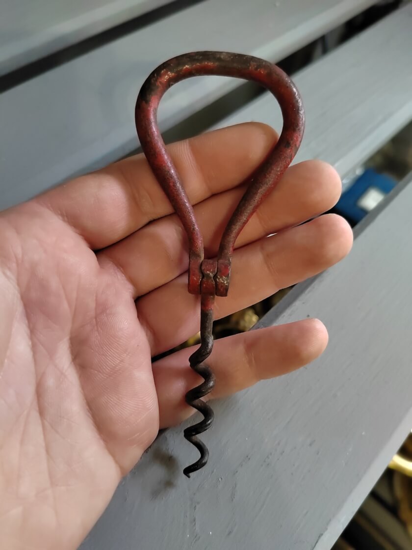 Великолепный коллекционный кованый штопор. Произведен в первой половине 20 века в Англии. Рукоятка в виде кольца. Механизм в центре позволяет складывать штопор так, чтобы винт оказался в центре кольца-рукоятки. Кованые штопора отличаются особой надёжностью и долговечностью. Сохранился в хорошем состоянии. Может применяться по назначению. Ручной штопор — оригинальный винтажный кухонный прибор. Станет интересным элементом в интерьере кухни или загородного дома. Будет приятным подарком для мужчины, охотника, рыболова, коллекционера. За счёт складного механизма, удобен в путешествиях и выездах за город.