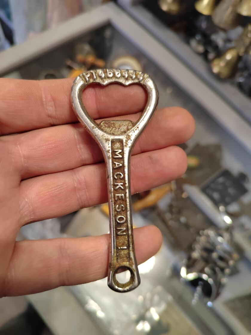 Антикварная открывашка для бутылок с жестяными крышками. Произведена в Англии в начале 20 века. Оформлена выгравированной надписью «Mackeson» и индивидуальным номером. Сохранилась в хорошем состоянии. Редкий коллекционный экземпляр. Может использоваться по назначению. Удобна для подвешивания и хранения, снабжена кольцом. Станет оригинальным и функциональным элементом кухонного декора или частью коллекции.
