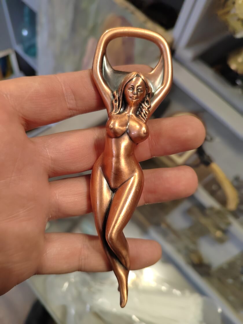 Антикварная открывашка для бутылок с жестяными крышками. Произведена в Англии в 20 веке. Оформлена в виде обнаженной женщины. Редкий коллекционный экземпляр. Может использоваться по назначению. Удобна для подвешивания и хранения. Станет оригинальным и функциональным элементом кухонного декора или частью коллекции. Прекрасный подарок для ценителя.