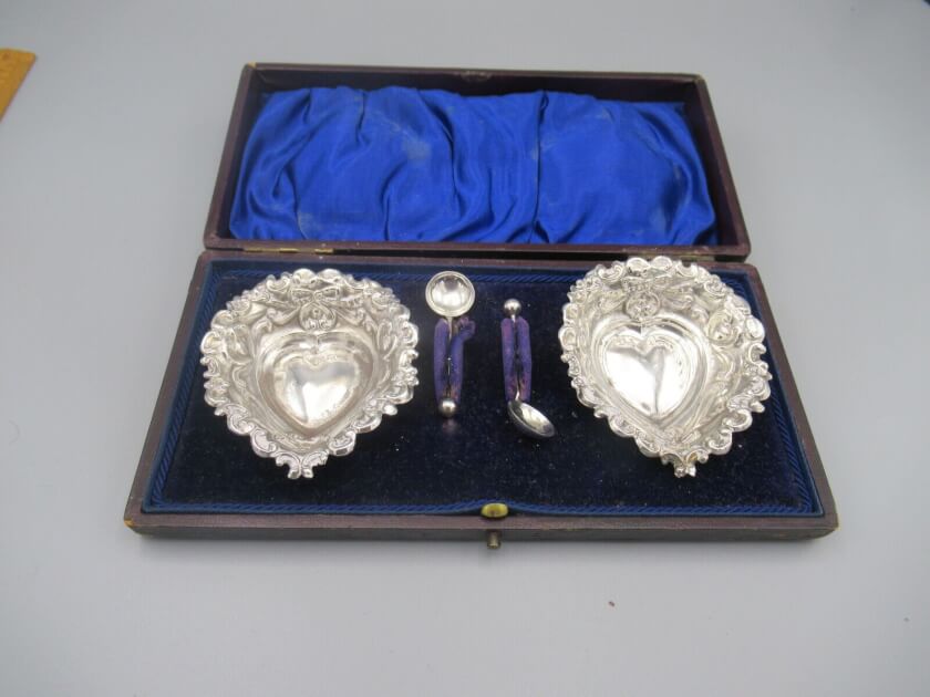 Восхитительный старинный набор из 2 солонок/сахарниц и 2 ложек. Комплект оформлен в Викторианском стиле, создан из стерлингового серебра, произведен в Бирмингеме, Англия, на мануфактуре Уильяма Девенпорта в 1899 году. Стоят клейма от производителя. Набор лежит в родном кейсе на синем бархате с ячейками. Чаши и ложки сохранились в прекрасном состоянии, не были в использовании. Украшены объёмными витиеватыми узорами. Станут восхитительным элементом декора кухонного интерьера, сервировки стола или интересным подарком для ценителя антикварного серебра. Все лоты выставлены на нескольких площадках поэтому, пожалуйста, перед покупкой уточняйте наличие.