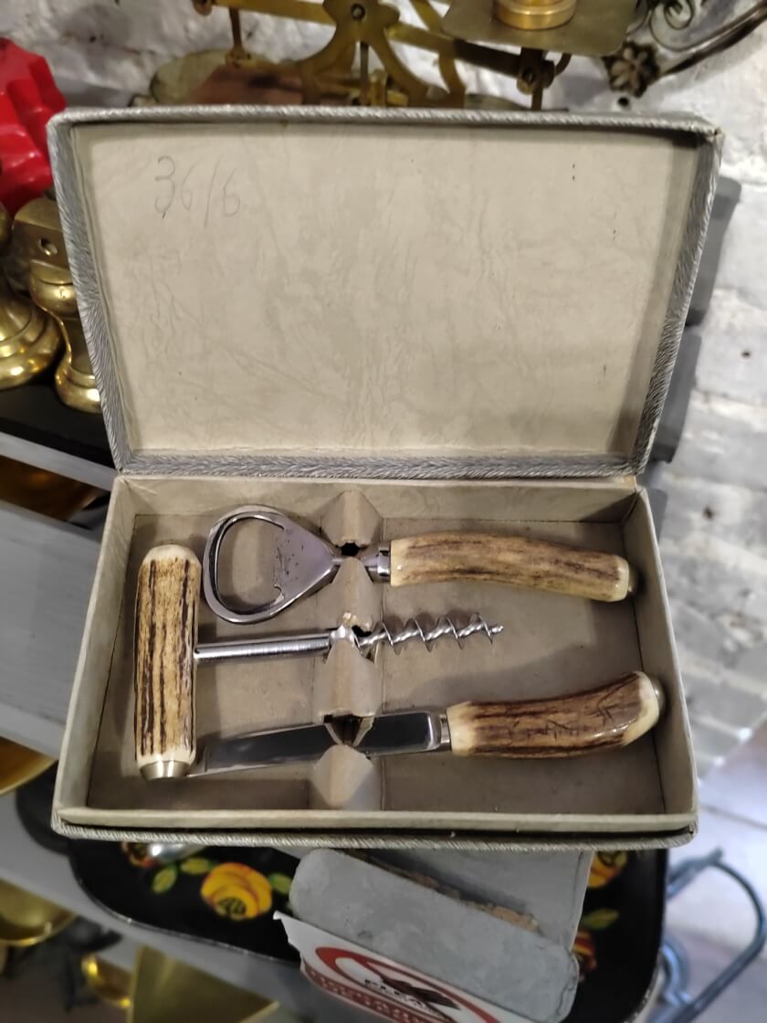 В антикварный набор входят 3 предмета со своим определенным назначением: сырный нож, штопор и открывашка / открывалка. Комплект создан в Англии в первой половине 20 века. Лежит в родном футляре на светлом бархате. Рукоятки произведены из рога оленя. Такой набор — настольный помощник человека, который любит эстетику и историю алкогольных напитков, относиться с уважением к элитному алкоголю и любит себя баловать. Все лоты выставлены на нескольких площадках поэтому, пожалуйста, перед покупкой уточняйте наличие.