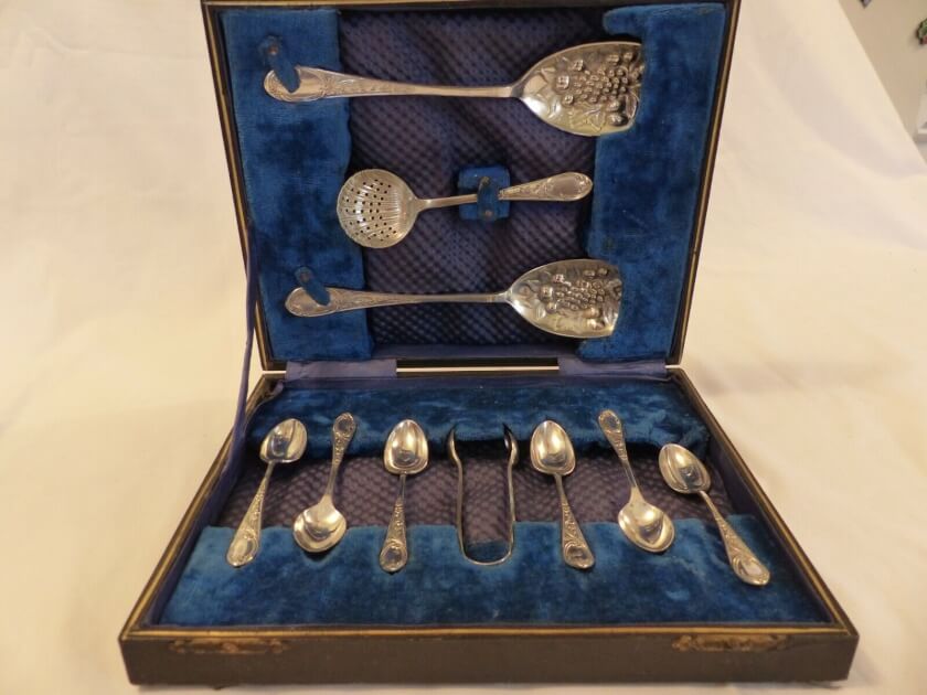 Антикварный набор приборов к чаю. Включает в себя: 6 чайных ложек, щипцы для сахара, ложку-просеиватель и две крупные ложки для раздачи десертов, ягод, мороженого. Приборы украшены объёмными изображениями цветов и ягод. Комплект произведен в Англии, покрыт стойким серебрением. Лежит в родном кейсе на синем бархате. Сохранился в прекрасном состоянии. Станет великолепным, функциональным элементом кухонного декора и сервировки стола к чаю. Все лоты выставлены на нескольких площадках поэтому, пожалуйста, перед покупкой уточняйте наличие.