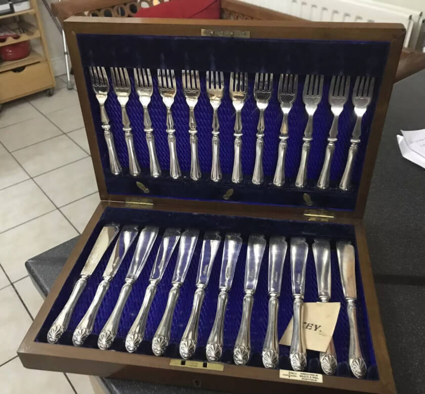 Винтажный набор столовых приборов из 24 штук. Сервировка на 12 персон. В комплект входят 12 ножей (длина 20см) и 12 вилок (длина 17.5см). Набор произведен в 1916 году на мануфактуре Walker & Hall в Англии, лежит в родной коробке на синем бархате. Стоят клейма от производителя. Приборы покрыты стойким серебрением. Находятся в отличном состоянии. К комплекту прилагается сертификат от производителя. Станет восхитительным украшением кухонного интерьера и чудесным дополнением сервировки стола. Все лоты выставлены на нескольких площадках поэтому, пожалуйста, перед покупкой уточняйте наличие.