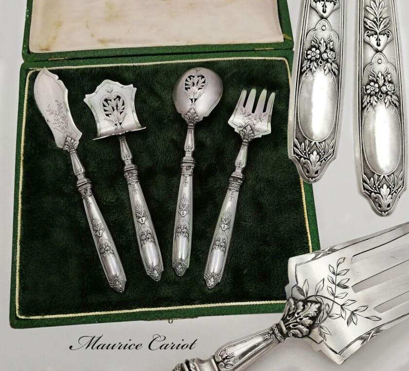 Антикварный сервировочный набор для десертов из четырех предметов. Включает в себя крупный нож, лопатку, раздаточные ложку и вилку. Приборы созданы из французского стерлингового серебра 950 пробы. Стоят клейма от производителя. Набор произведен в начале 20 века на мануфактуре Maurice Cariot во Франции. Украшен ажурным витиеватым рисунком из аканта и лавра. Лежит в родном кейсе на зелёном бархате. Сохранился в прекрасном состоянии. Станет интересным и функциональным элементом сервировки стола. Может активно использоваться в быту по назначению или в декоративных целях. Все лоты выставлены на нескольких площадках поэтому, пожалуйста, перед покупкой уточняйте наличие.