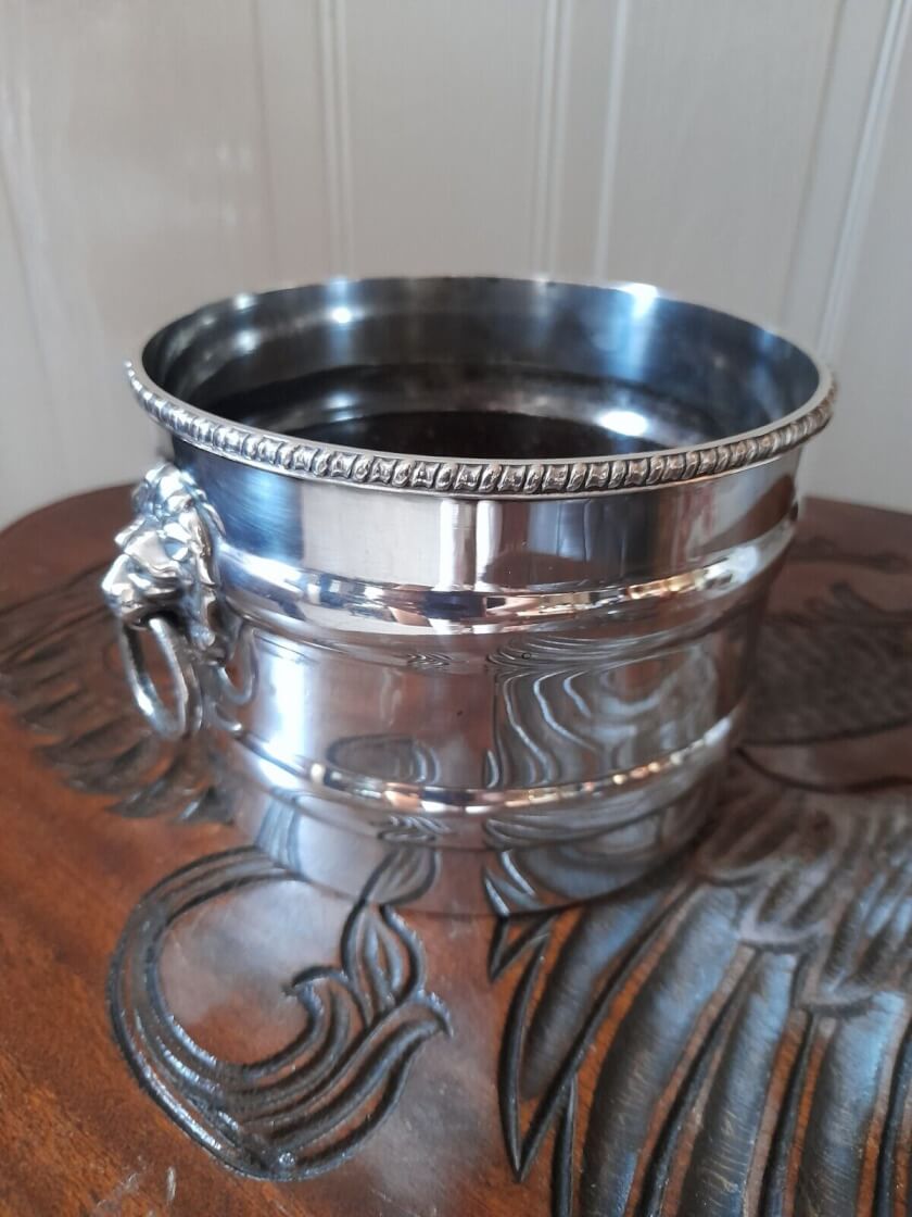 Старинное посеребренное ведро для льда / кашпо. Создано в Англии в середине 20 века. С двух сторон украшено объёмными львиными головами, держащими ручки-кольца. Начищено до блеска. Может использоваться как ведро/кашпо для цветов и растений или как ведро-охладитель для льда и бутылок вина, шампанского. Станет интересным и функциональным винтажным элементом интерьера комнаты или декора сада, огорода. Все лоты выставлены на нескольких площадках поэтому, пожалуйста, перед покупкой уточняйте наличие.