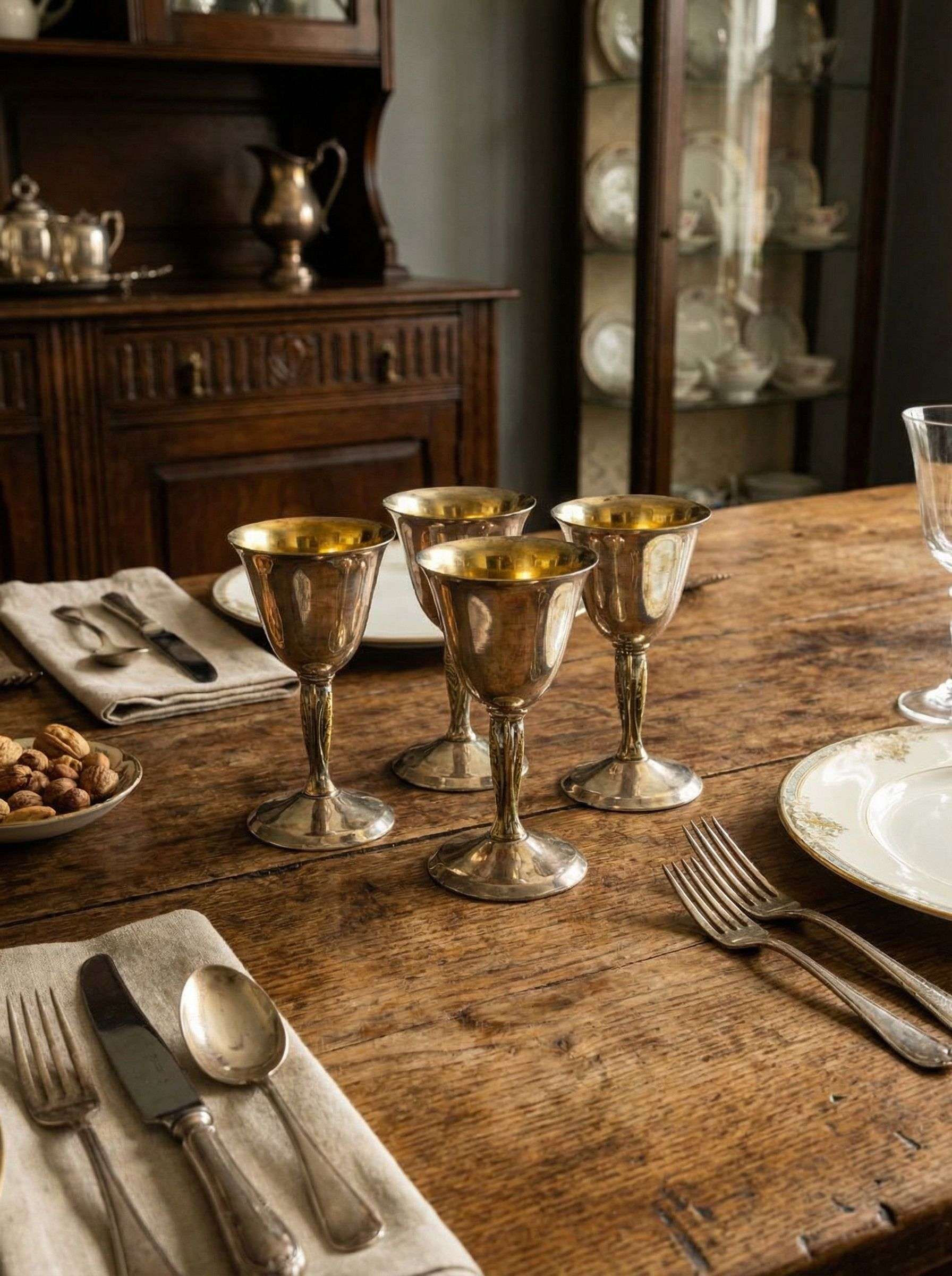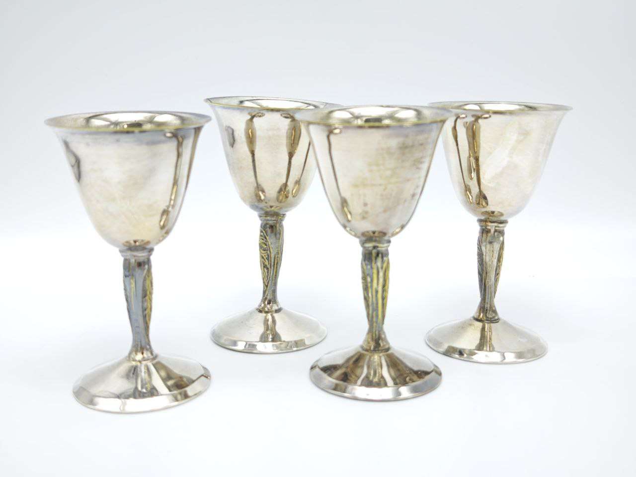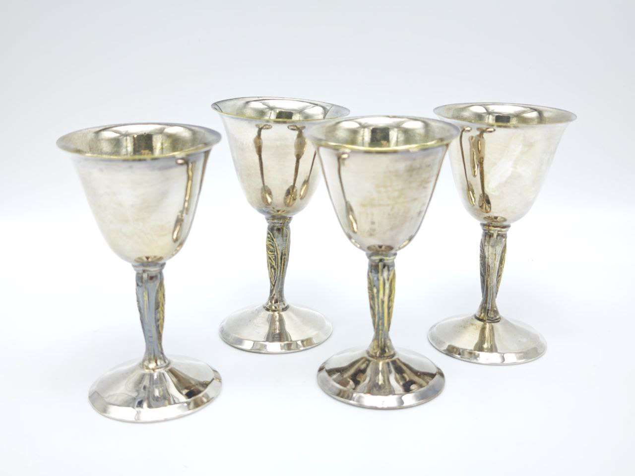 Набор из четырёх серебрёных рюмок на ножке, изготовленных в Англии в 1950-е годы. Классическая форма чаши сочетается с изящной вытянутой ножкой с декоративным рельефом, характерным для английской столовой утвари середины XX века. Внутренняя поверхность с тёплым золотистым оттенком подчёркивает благородство серебрения. Набор подходит для сервировки крепких напитков и станет выразительным акцентом в винтажной или классической подаче стола. Высота каждой рюмки — 9,5 см.