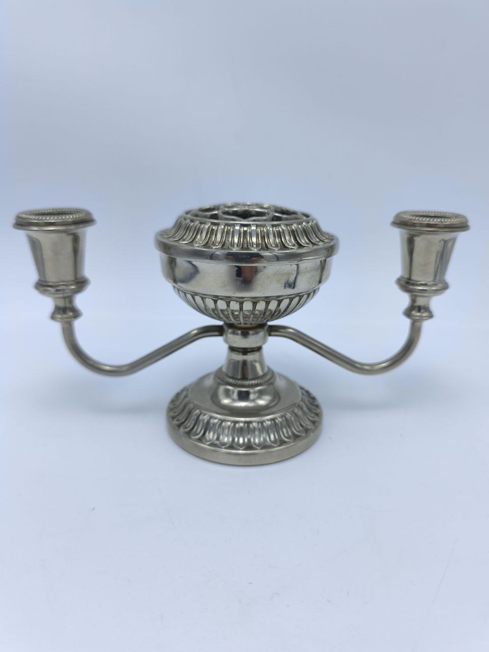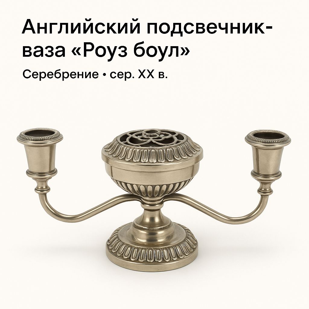 Редкий винтажный английский подсвечник-ваза «Роуз боул» с серебрением — изысканный предмет, сочетающий утилитарность и декоративность. Центральная чаша с съёмной сеткой предназначена для эффектной цветочной композиции, а боковые держатели для свечей создают атмосферу уюта и торжества. Изготовленный в Англии (предположительно середина XX в.), он сохранён в прекрасном состоянии и готов стать жемчужиной вашего интерьера или коллекци