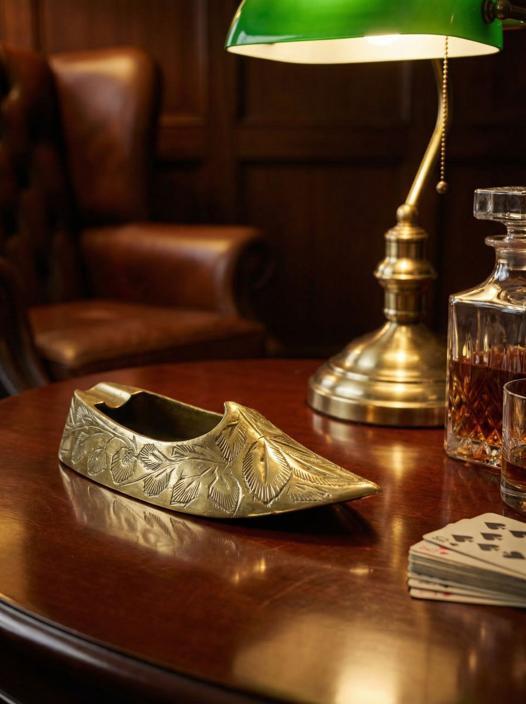 Изящная латунная пепельница, выполненная в форме миниатюрной туфельки с тонкой ручной гравировкой в виде листьев. Производство — Индия, 1950 год. Компактная длина 9 см и вес 42 г делают её удобной для размещения на письменном столе, журнальном столике или в кабинете. Тёплый оттенок латуни и аккуратная фактура создают выразительный интерьерный акцент в винтажном стиле.