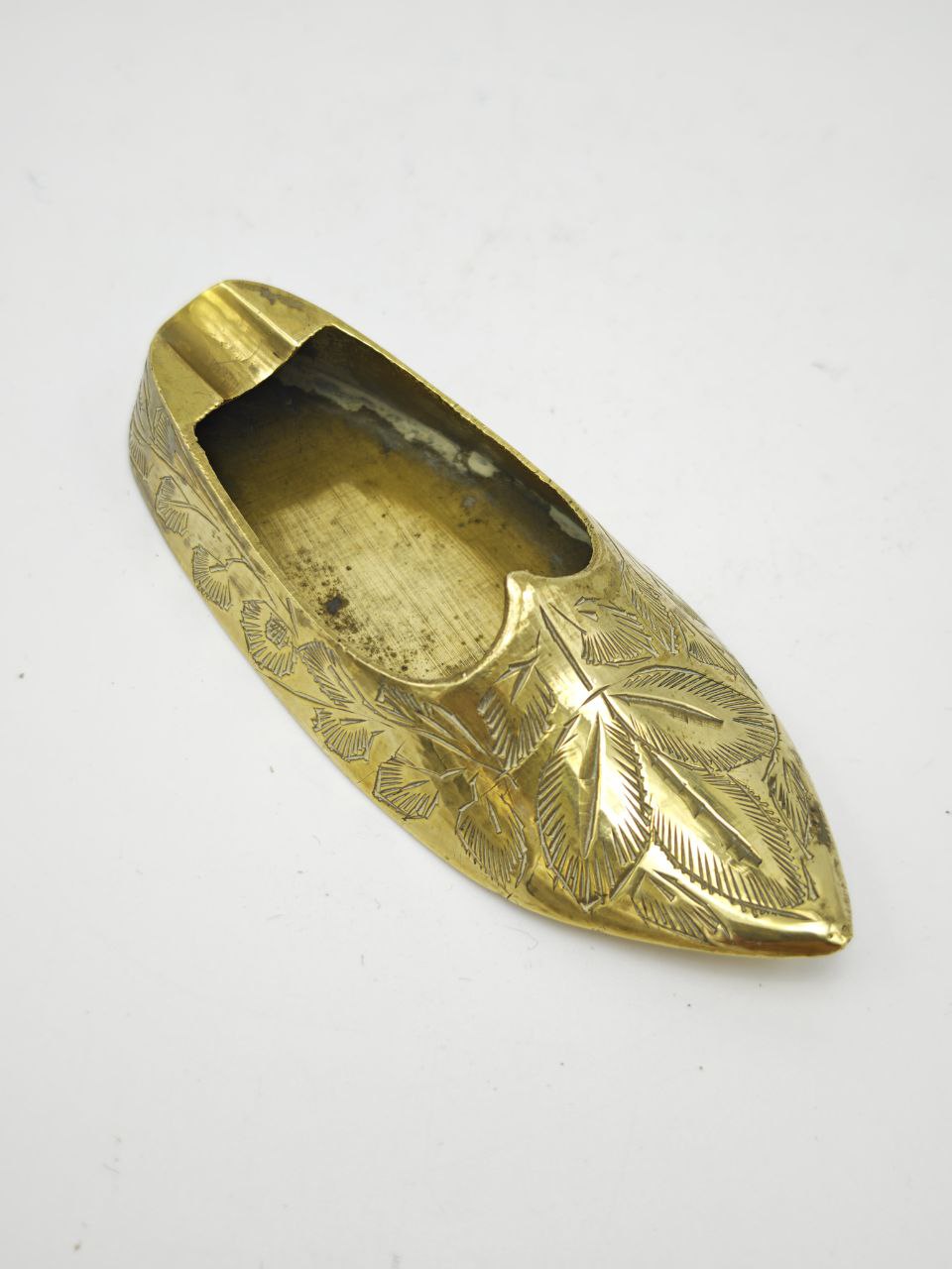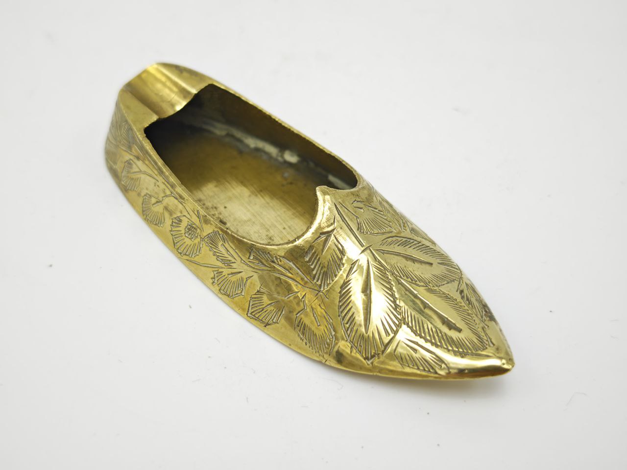 Антикварная латунная пепельница в форме туфельки с гравированным растительным орнаментом, длина 9 см, Индия, 1950 г.