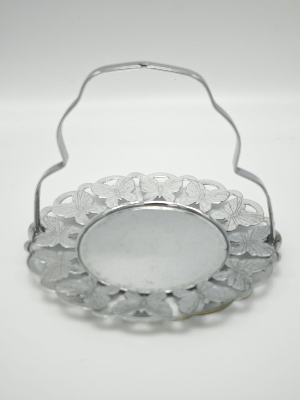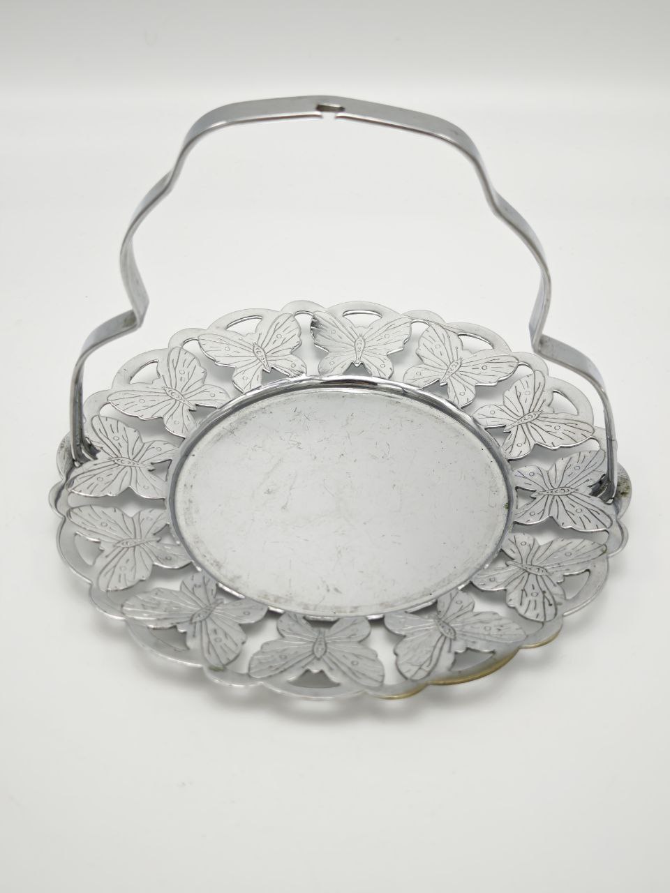Антикварная серебрёная вазочка для конфет с ажурным бортиком из бабочек и ручкой, диаметр 15 см, высота 11,5 см, 1910 год, Англия