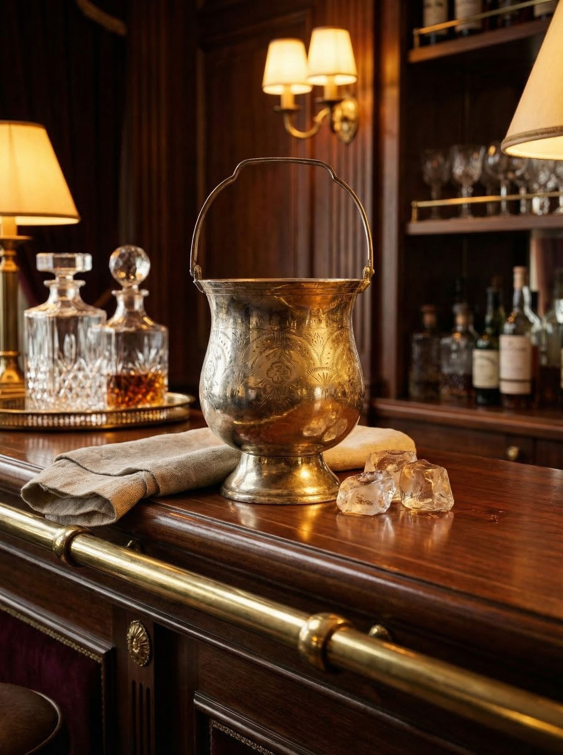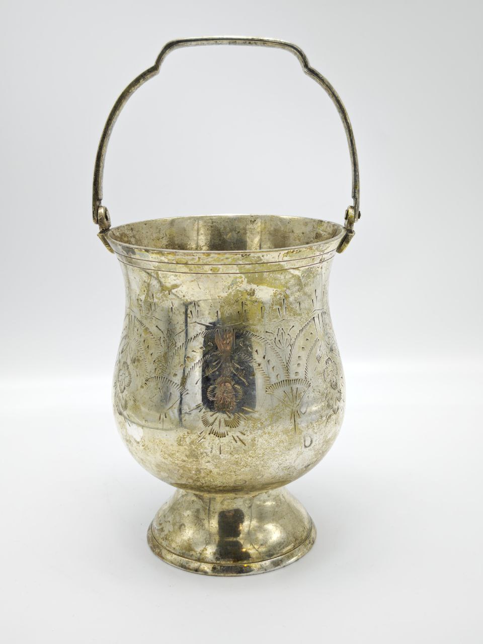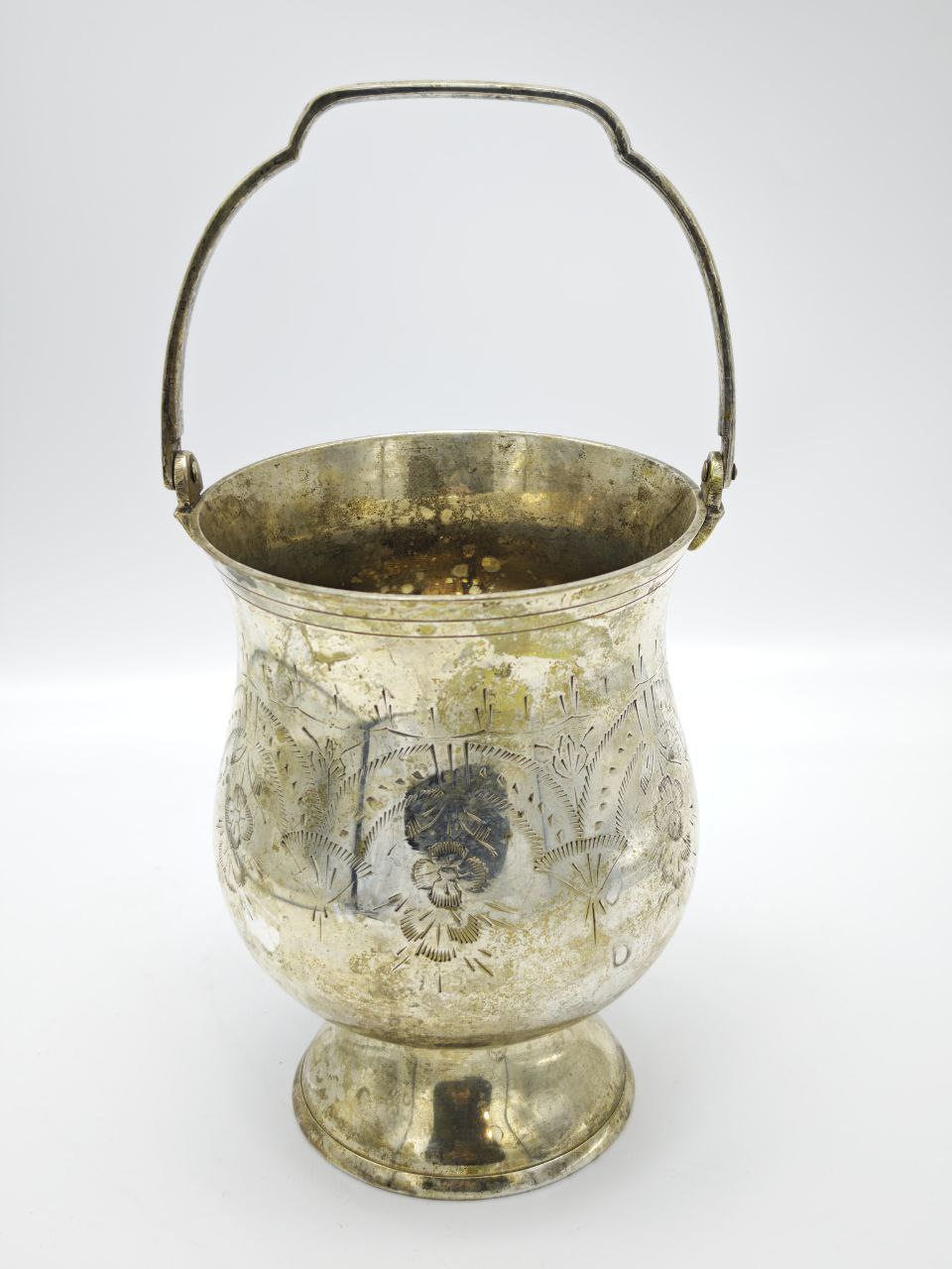 Антикварное ведро для льда, изготовленное в Великобритании в 1910 году. Корпус выполнен из металла с серебрением и украшен декоративной ручной гравировкой с цветочным орнаментом. Классическая форма на ножке дополнена удобной подвижной ручкой для переноски, что делало такие ведра неотъемлемой частью барной сервировки начала XX века. Предмет использовался для подачи льда во время сервировки напитков и коктейлей. Высота изделия с ручкой составляет 26 см, вес 700 г.