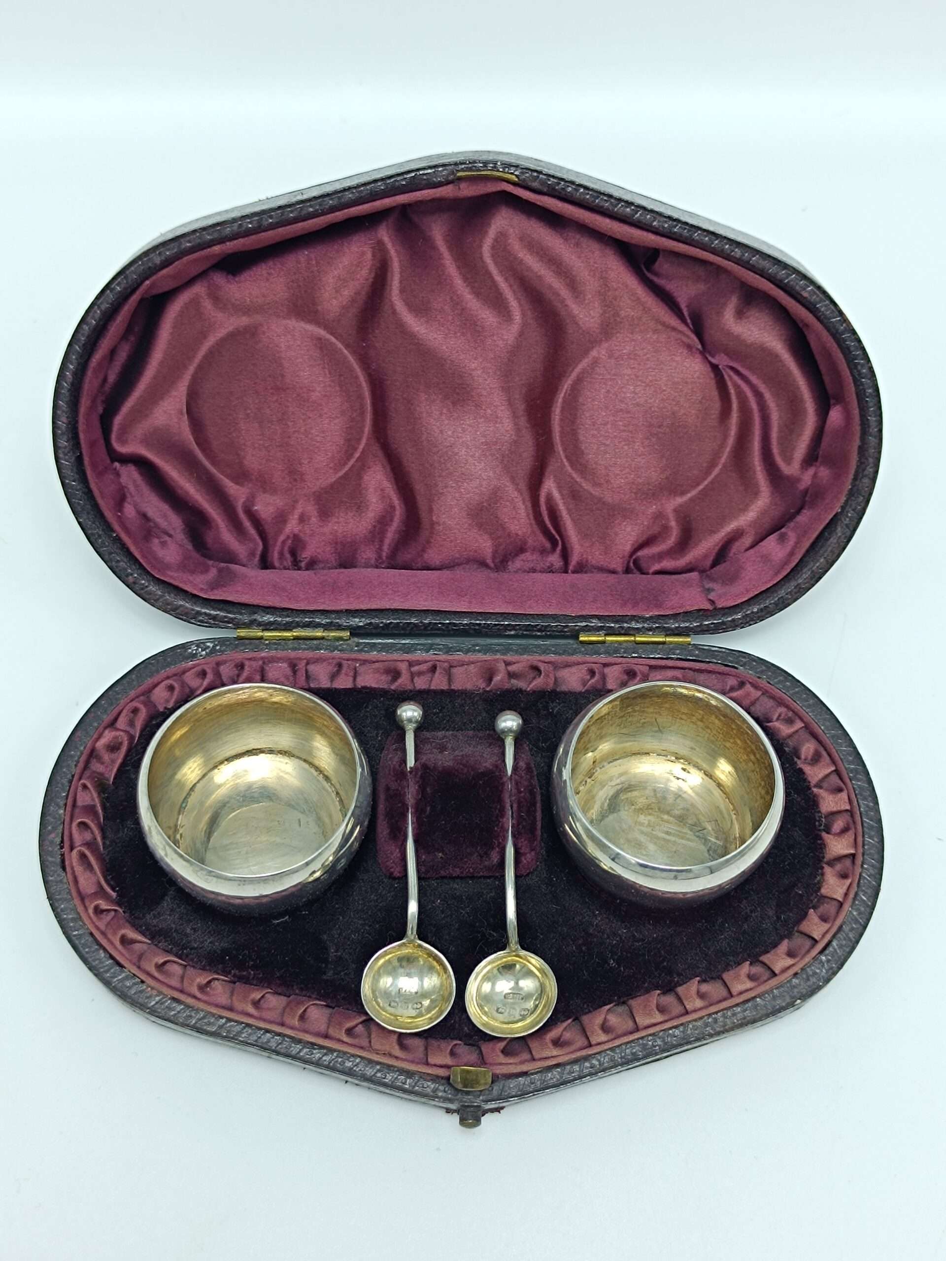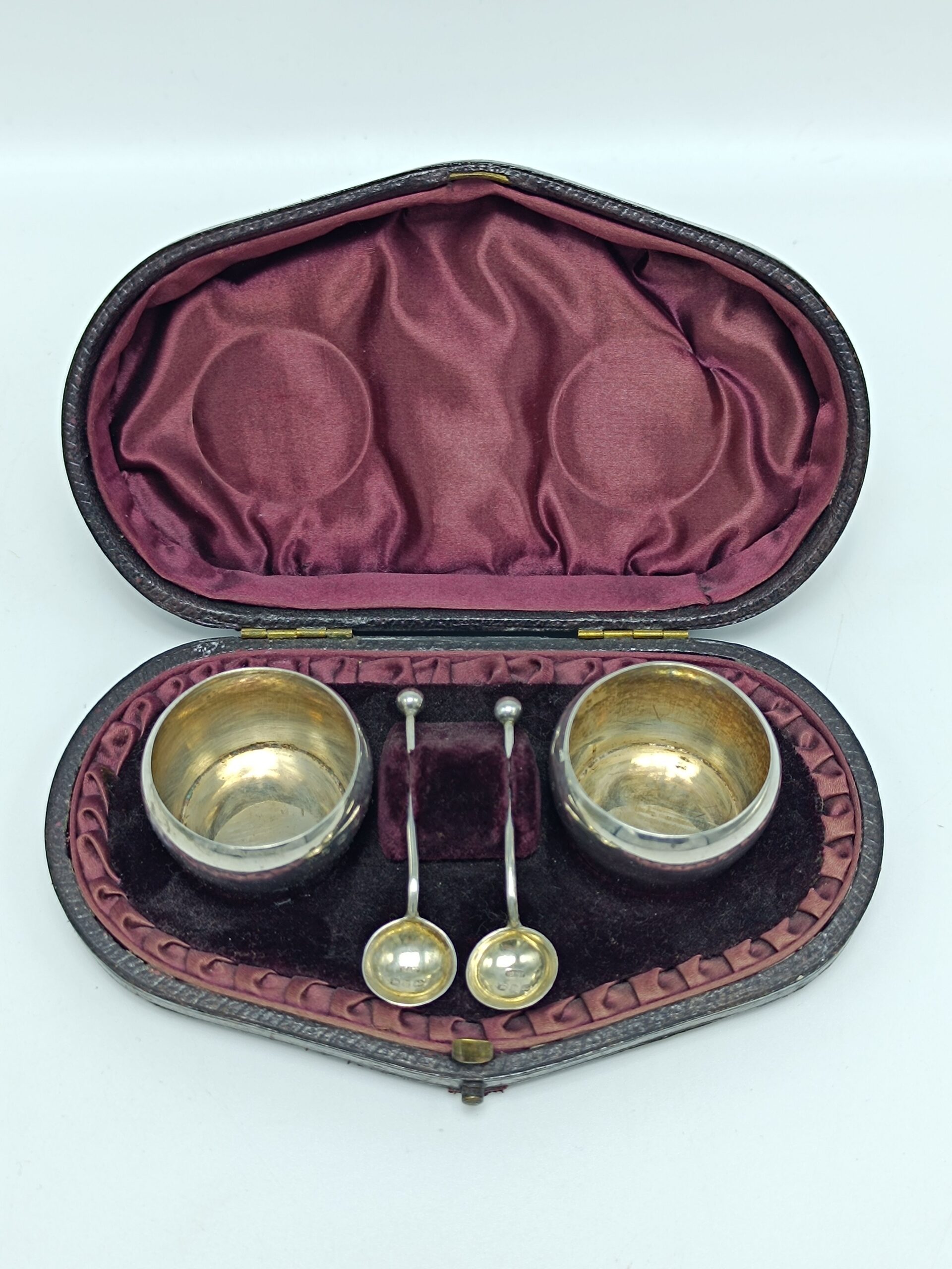 Антикварные серебряные солонки с ложечками. Англия. Кейс Вес серебра 35 грамм Солонка 2.3х3.5 см, длина ложечки 5.5 см