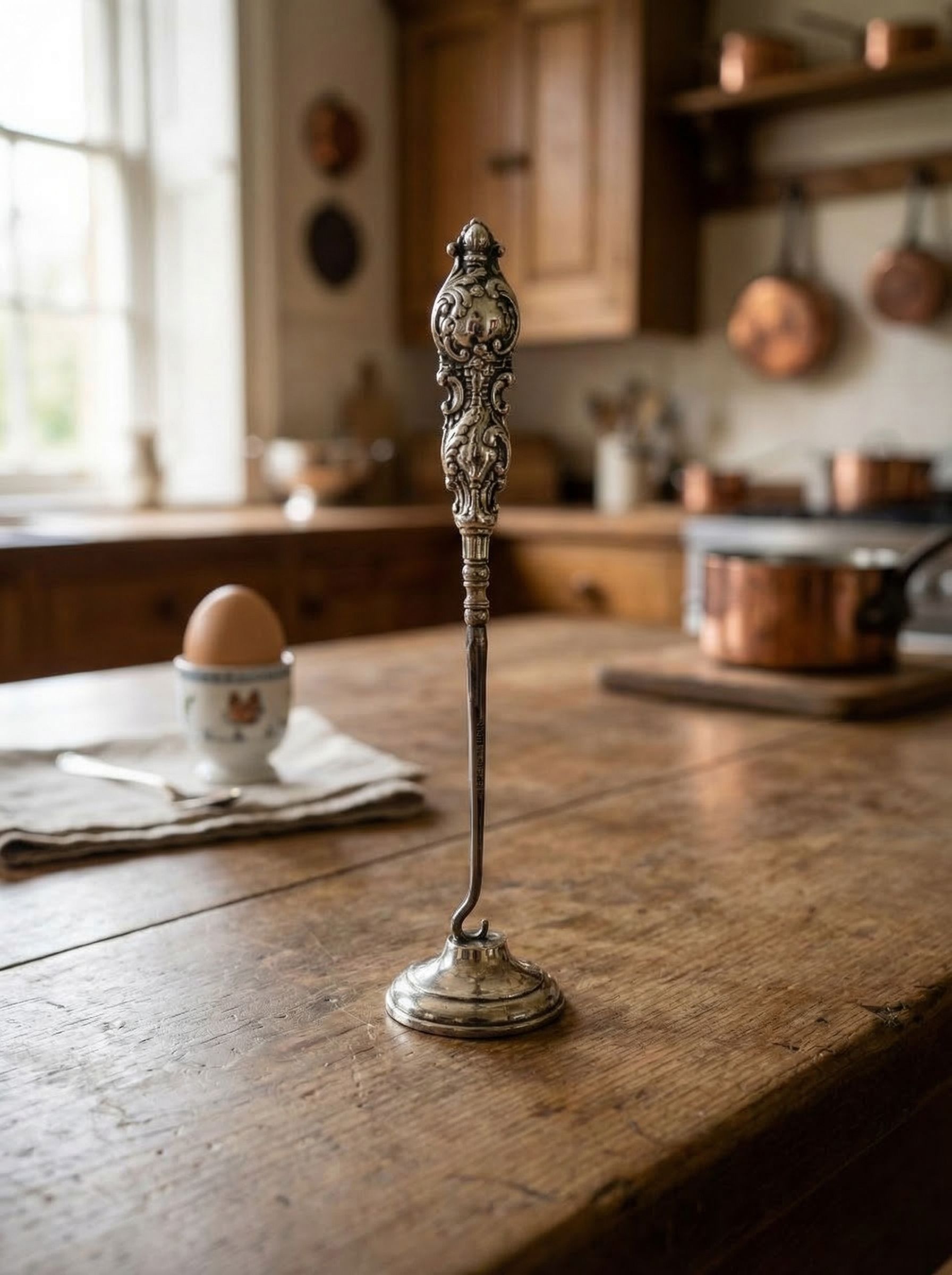 Антикварный крючок для извлечения кодлера выполнен из благородного металла и изготовлен в Англии в 1900 году. Изящная рукоять украшена рельефным орнаментом в стиле викторианской декоративной пластики с цветочными элементами и плавными завитками. Длина предмета составляет 17 см, что делает его удобным для работы с горячими кодлерами и сервировки завтраков. Подходит как функциональный кухонный аксессуар и как выразительный предмет коллекционирования английской столовой утвари.