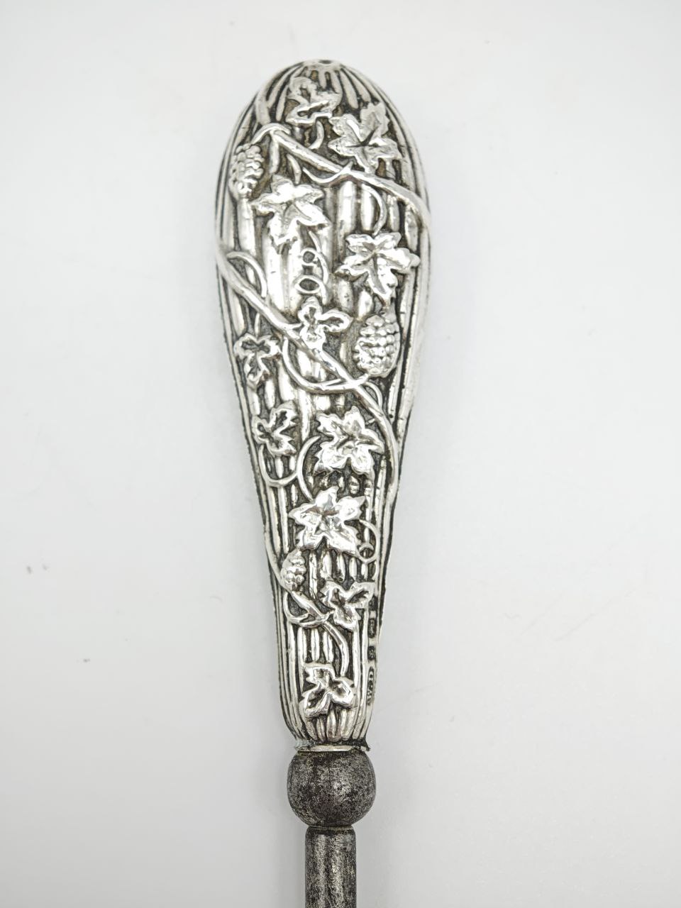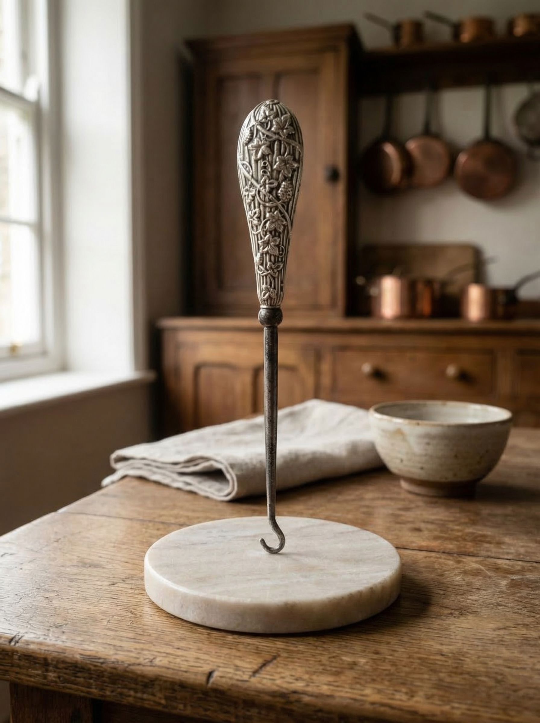 Крючок для кодлера изготовлен в Англии в 1902 году и украшен выразительным рельефным орнаментом в виде ветвей и листьев плюща. Рукоять выполнена в характерной для английской утвари начала XX века декоративной манере с тонкой проработкой деталей и глубокой фактурой. Длина предмета составляет 16,5 см, благодаря чему им удобно извлекать горячий кодлер во время приготовления или сервировки завтрака. Элегантная форма и художественный рельеф делают этот кухонный аксессуар выразительным элементом английской сервировки.