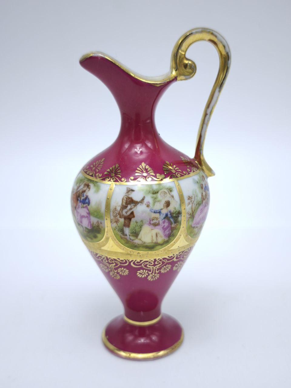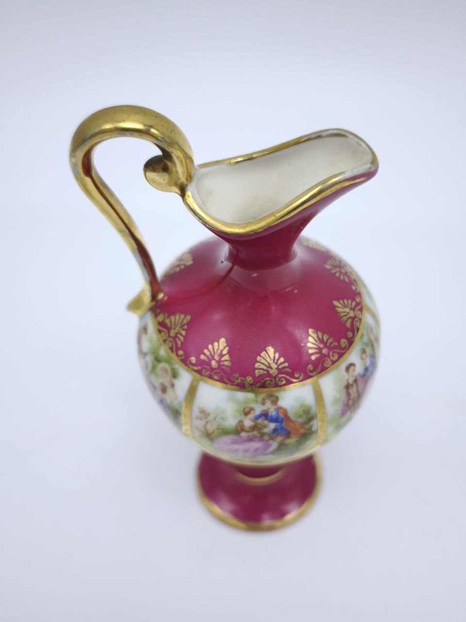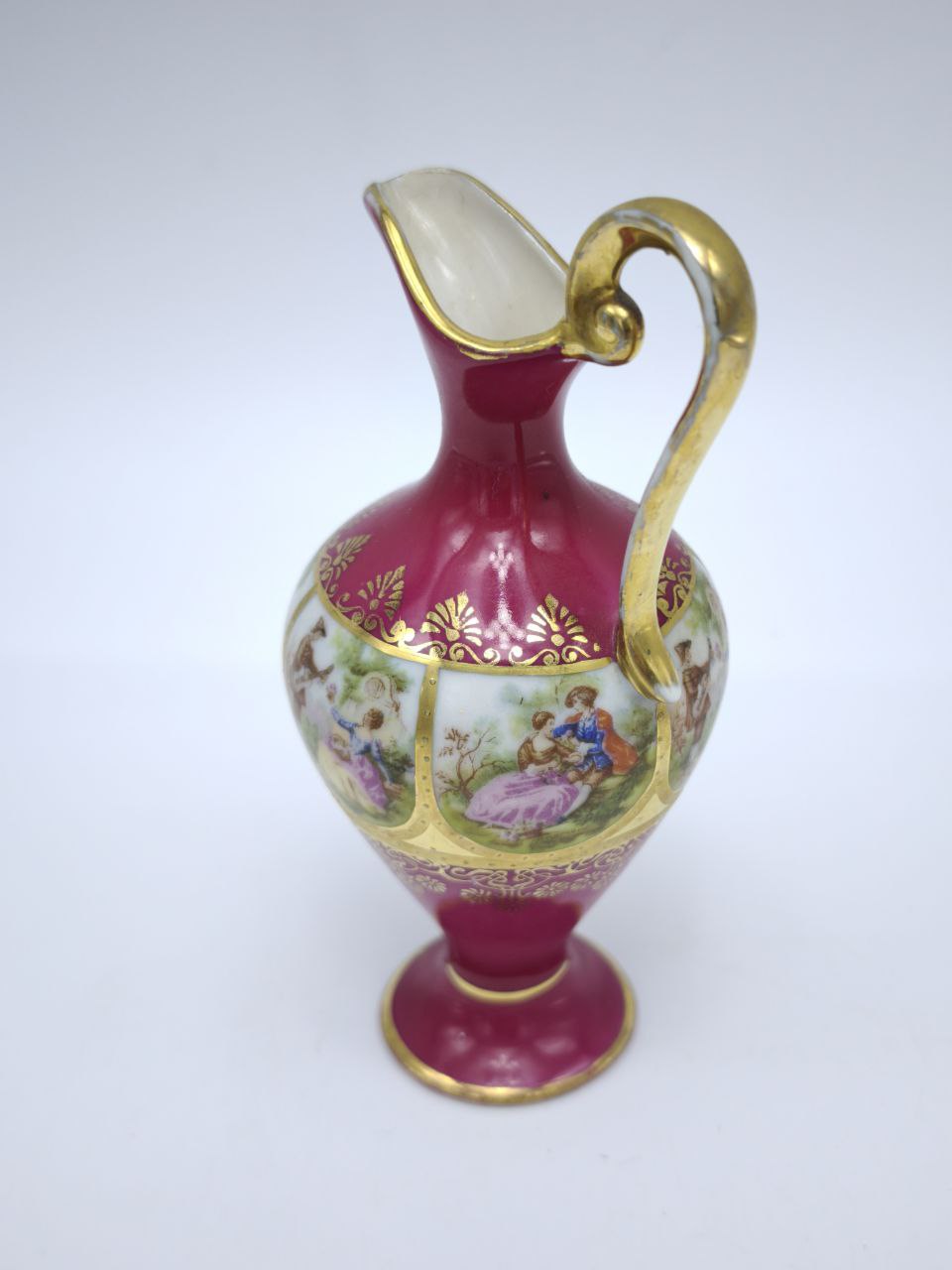 Представляем вашему вниманию изысканный антикварный миниатюрный кувшин, выполненный из тончайшего фарфора и украшенный позолотой. Это произведение искусства, созданное в лучших традициях изящного фарфорового мастерства, способно стать неотъемлемой частью вашего интерьера или коллекции винтажных предметов. Этот кувшин сочетает в себе изысканный стиль и утонченную элегантность, привнося в любое помещение атмосферу классического шарма и роскоши.Впечатляющая красота этого миниатюрного кувшина заключается в его ручной росписи. Каждая деталь была тщательно проработана мастерами, что делает его настоящим произведением искусства. Изображения на кувшине, выполненные в пастельных и насыщенных тонах, рассказывают свою историю, вдохновляя на путешествие в далекое прошлое, когда каждая вещь имела свою душу и рассказ. Бархатно-красный оттенок кувшина в сочетании с золотистым орнаментом создают эффект роскошной гармонии и возвышенности.Этот миниатюрный кувшин — идеальный подарок для ценителей искусства и коллекционеров антиквариата. Будет уместен в качестве уникального интерьерного акцента в гостиной, спальне или кабинете. Может использоваться как самостоятельный предмет декора или в сочетании с другими декоративными элементами, подчеркивая ваш индивидуальный стиль и вкус. Такой кувшин также станет прекрасным дополнением вашей коллекции винтажного фарфора, отражая вашу приверженность к вечным ценностям и эстетике прошлого.Созданный с вниманием к каждой детали, этот кувшин способен стать настоящей жемчужиной вашего интерьера. Благодаря своей элегантности и уникальности, он подарит вашим гостям незабываемые впечатления и разговоры о красоте и истории.