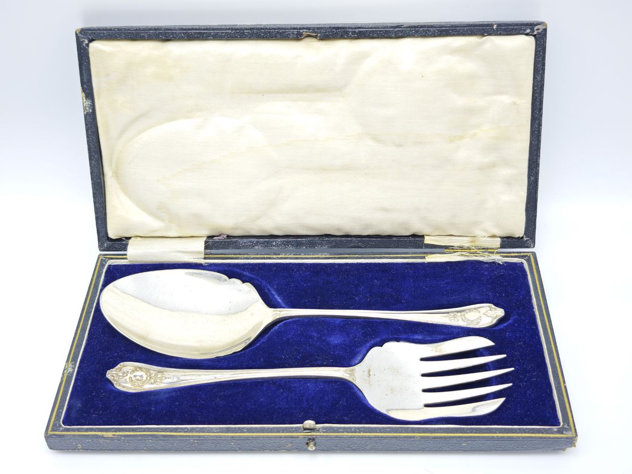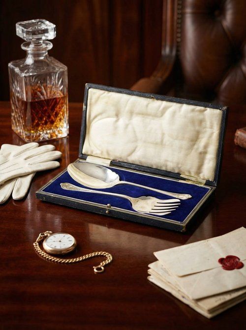 Главная // Интернет-магазин // Новинки // Антикварный набор для сервировки стола в кожаном кейсе, ложка 23 см и вилка 22 см, серебрение, Англия 1911 год