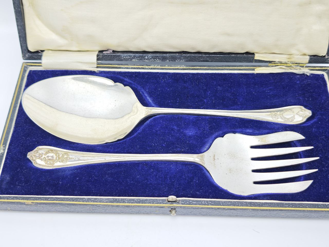 Англия, 1911 год. Набор для сервировки выполнен в технике серебрения, клейма W.S.S и британские пробирные знаки подтверждают происхождение. В комплекте сервировочная ложка длиной 23 см и вилка 22 см — выразительная классическая форма с декоративным окончанием ручек. Кожаный кейс размером 27 × 13,5 см подчёркивает статус предмета и удобен для хранения. Общий вес набора 500 г — солидный баланс и приятная тяжесть в руке.