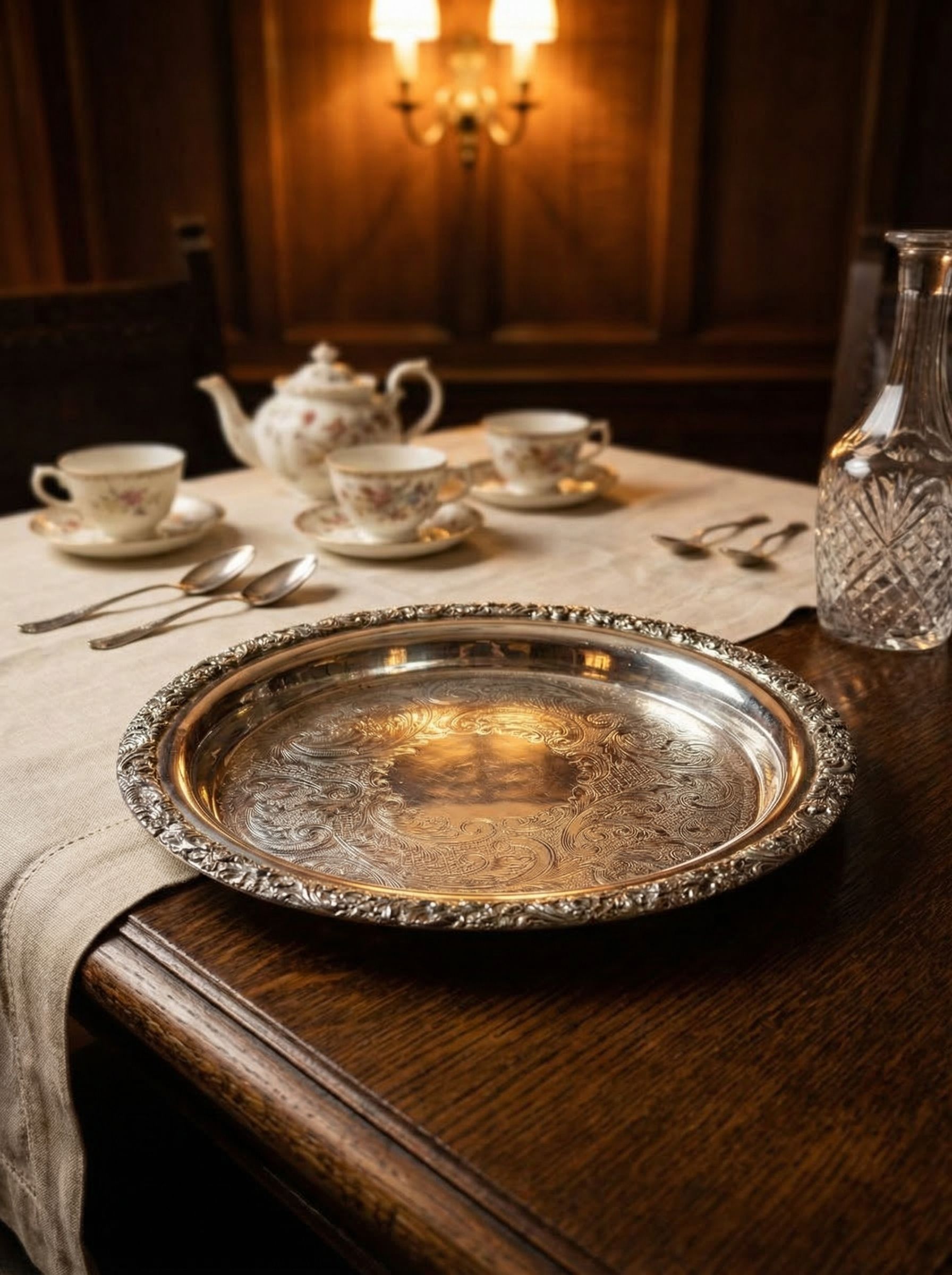 Круглый сервировочный поднос выполнен из металла с серебрением и украшен богатой гравировкой в классическом английском орнаменте. Высокий рельефный бортик с растительным декором придаёт изделию выразительный декоративный характер и делает поднос удобным для сервировки. Диаметр подноса составляет 26 см, высота борта — 4 см, вес изделия — 900 г. На основании присутствует клеймо производителя E.P.N.S и маркировка Made in Sheffield England. Поднос изготовлен в Англии в 1960 году и подходит для подачи напитков, десертов или использования как декоративный элемент сервировки.