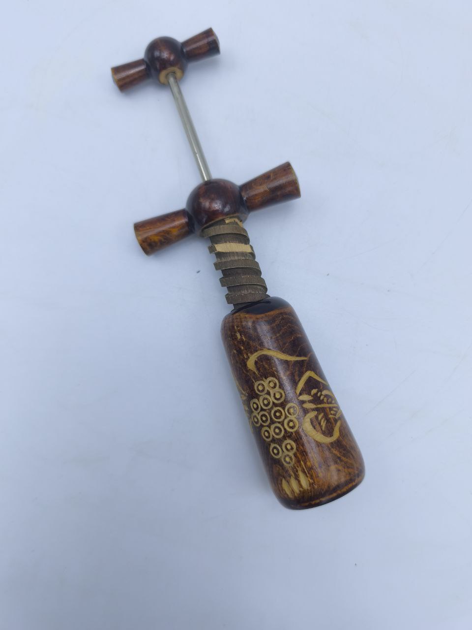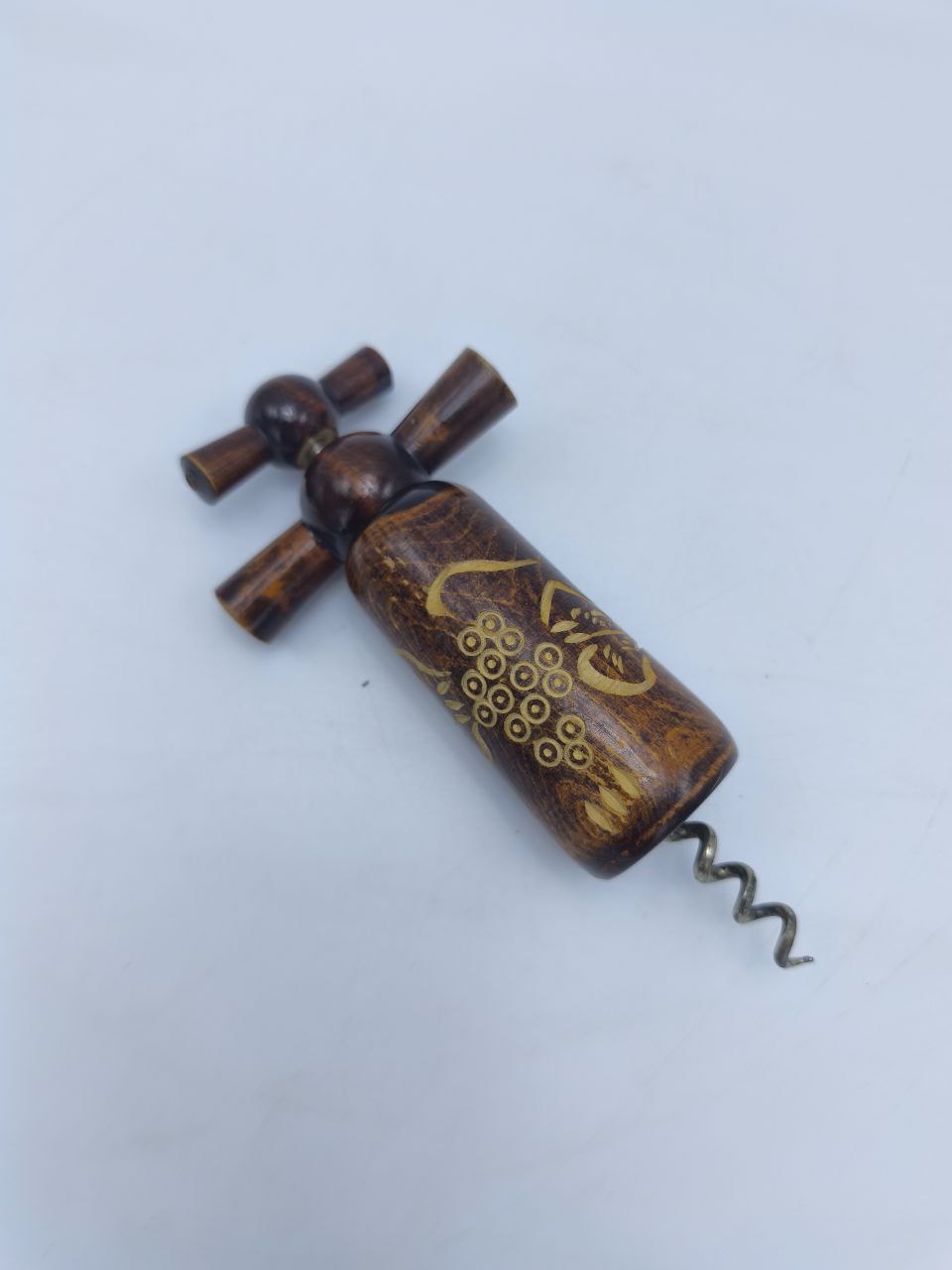 Этот винтажный штопор ручной работы сочетает в себе эстетику и функциональность. Тёплая фактура полированного дерева с гравировкой виноградной грозди придаёт предмету особый шарм. Механизм из металла остаётся прочным и надёжным, а дизайн отражает дух европейских изделий середины XX века. Отличный выбор для коллекции или изысканного подарка ценителю винной культуры.