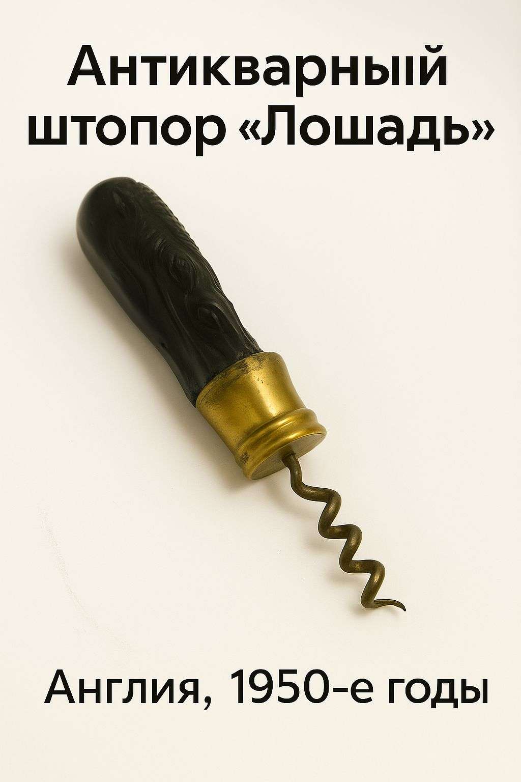 Винтажный антикварный штопор с ручкой в форме головы лошади.Изготовлен в Англии в 1950‑е годы. Латунный корпус и прочная стальная спираль, ручка из тёмного дерева с детальной резьбой. Отличный выбор для коллекционеров и ценителей стильных винтажных аксессуаров.