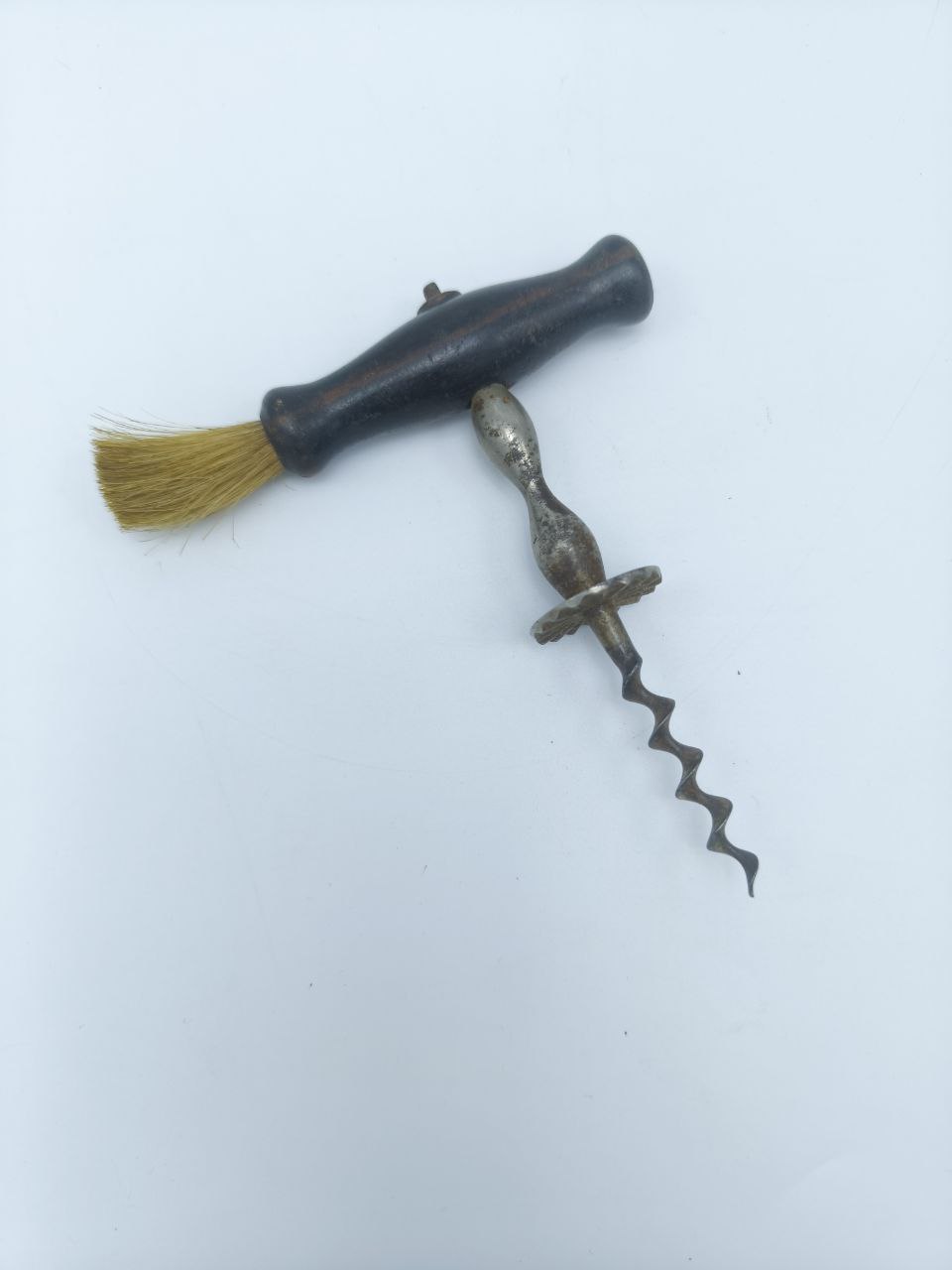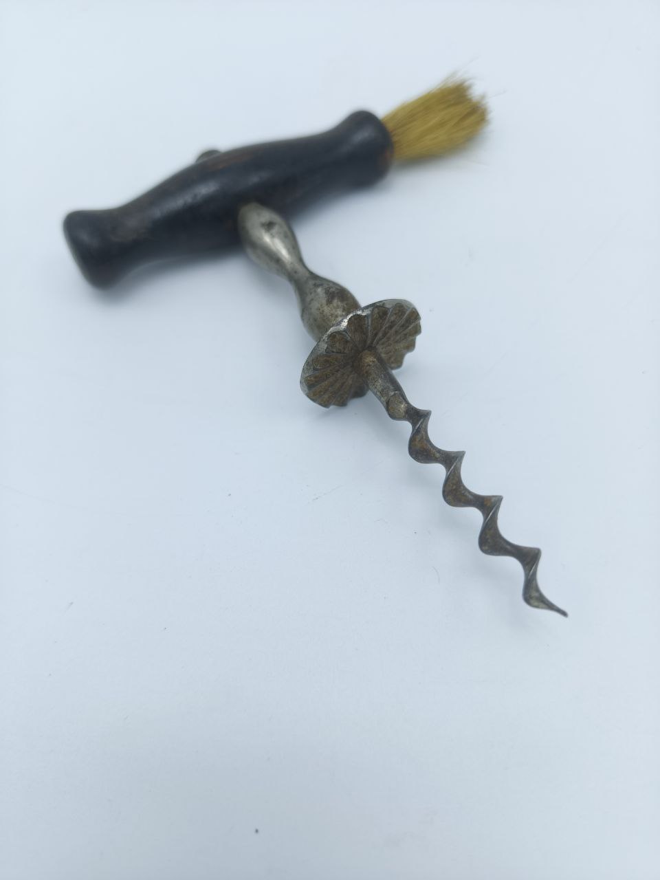 Погрузитесь в атмосферу прошлого с этим антикварным штопором, выполненным в викторианском стиле. Все детали — от изгибов ручки до спирали — отражают традиции ручного мастерства. Щётка на конце выполнена из натуральной щетины и служила для очищения горлышка бутылки от пыли и налёта, что было особенно актуально при длительном хранении вина.Ручка: дерево, натуральный патинаШтопор: стальной винт с витками в характерном víctorian Henshall‑стилеЩётка: натуральная щетина (вероятно барсучья или металлическая)Историческая ценность: редкость, коллекционный экземпляр