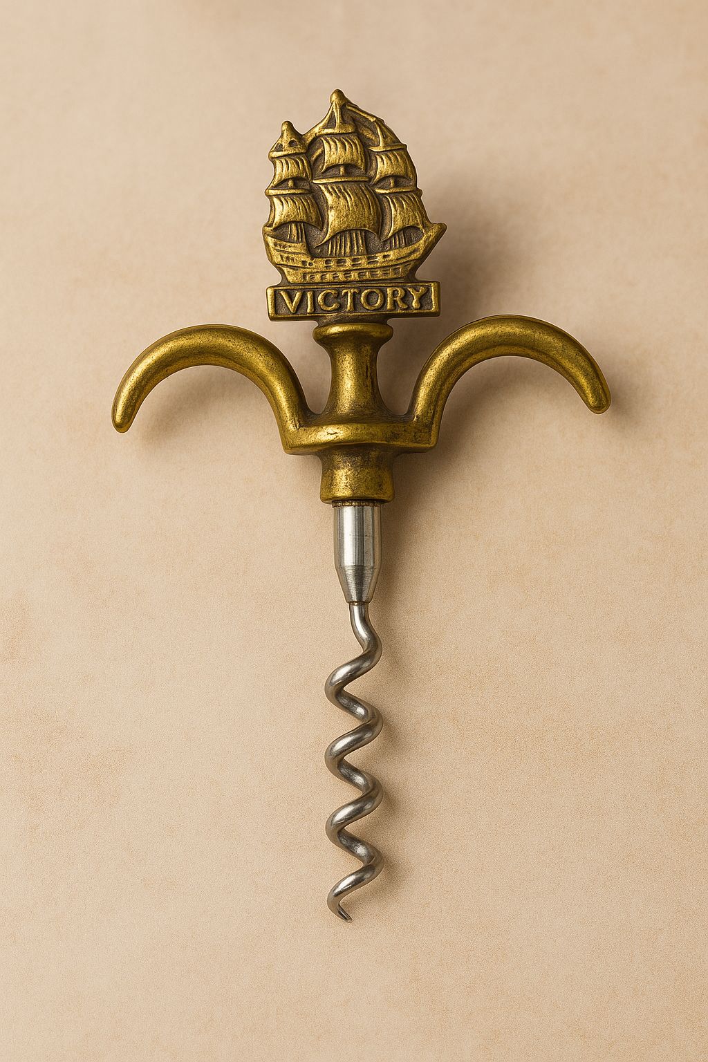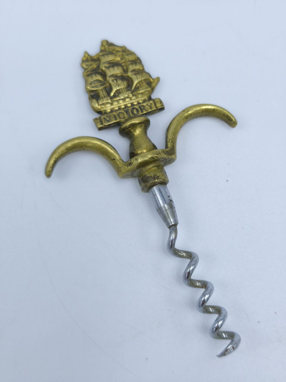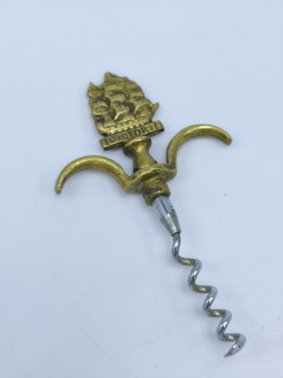 Редкий коллекционный штопор середины XX века, выполненный из латуни и стали. Рукоять украшена изображением легендарного британского корабля HMS Victory — символа морской славы Англии. Изящное сочетание золотистого оттенка латуни и холодного блеска металла делает этот предмет не только функциональным, но и декоративным акцентом для интерьера. Отличный выбор для коллекционеров, ценителей винной культуры и любителей морской истории.