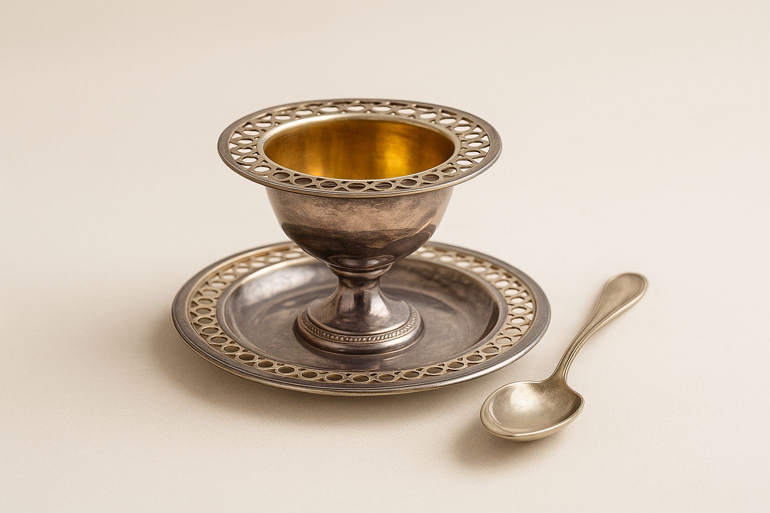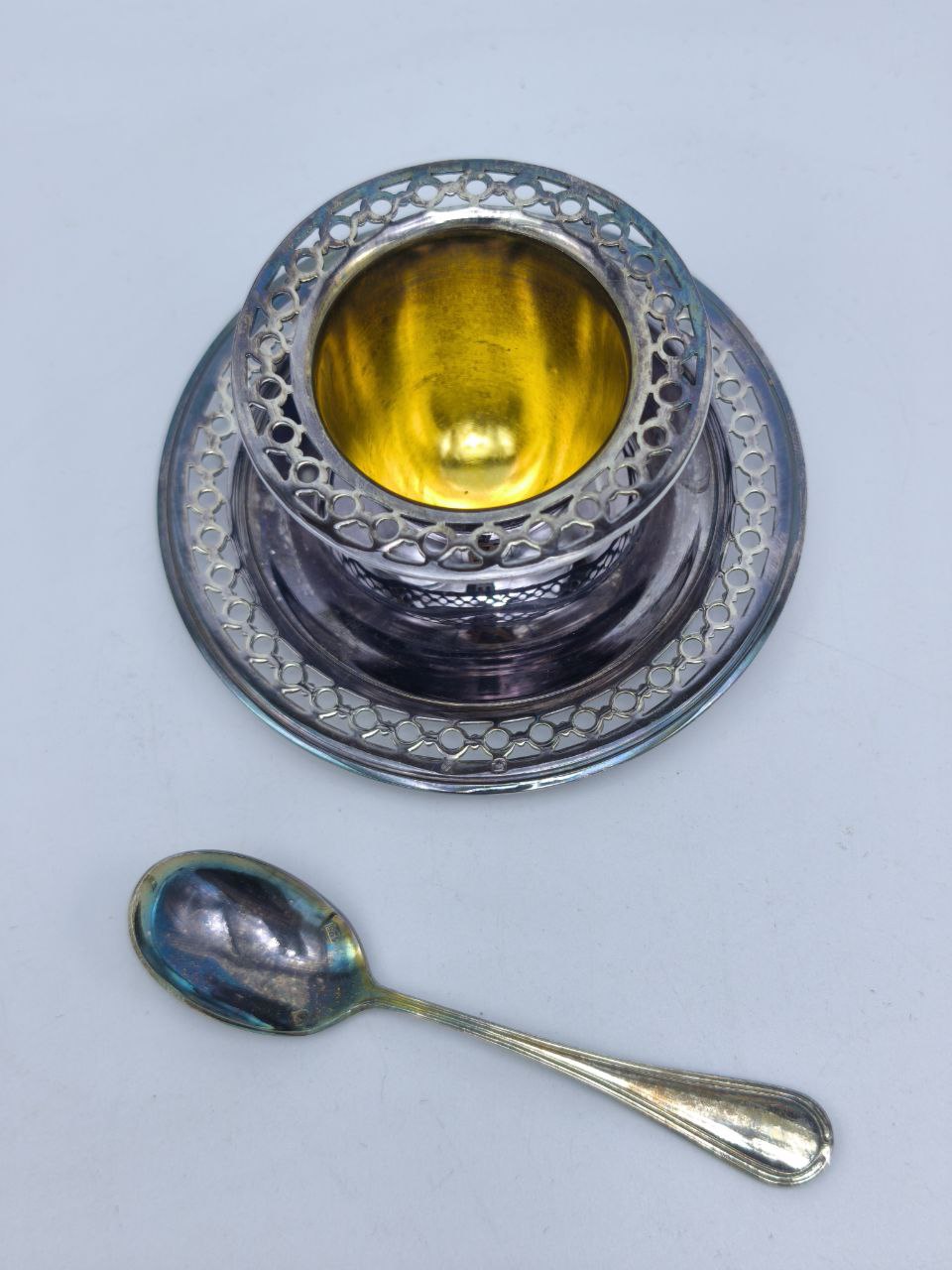 Элегантная пашотница из Германии 1920-х годов — пример тонкого столового искусства начала XX века. Серебрение снаружи и тёплая позолота внутри создают изысканный контраст, подчёркнутый ажурной отделкой. В комплект входит оригинальная ложка, что делает набор не только функциональным, но и коллекционно ценным предметом.