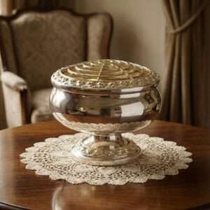 Крупный винтажный роузбоул предназначен для пышных цветочных композиций и оформления центральных зон интерьера. Чаша выполнена из посеребрённого металла с выраженным блеском и благородной патиной, подчёркивающей возраст предмета. Орнаментальный бордюр по краю и массивная ножка создают устойчивую, уравновешенную форму. Съёмная металлическая решётка позволяет равномерно распределять стебли, сохраняя аккуратную геометрию композиции. Размеры роузбоула — 14×20 см.