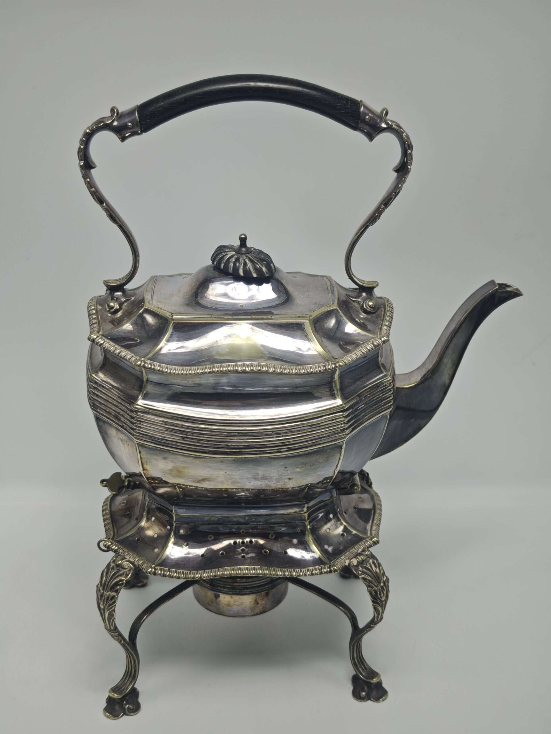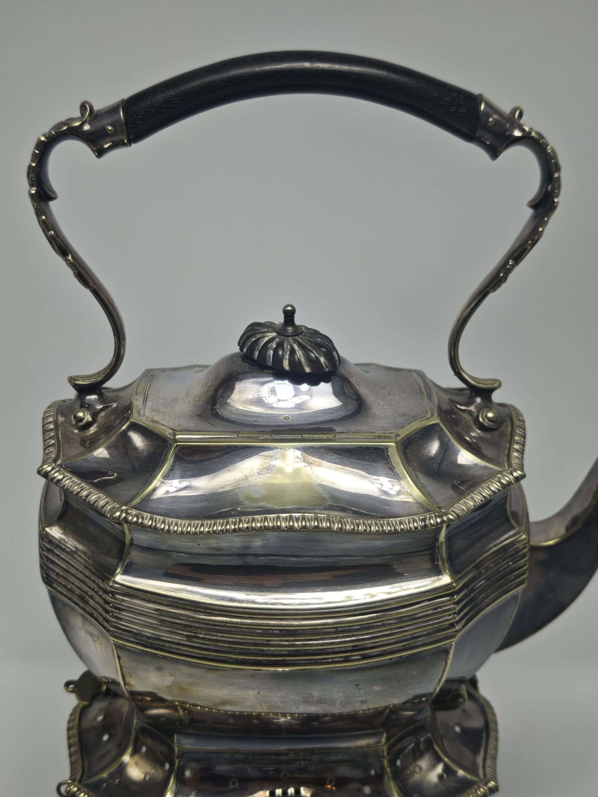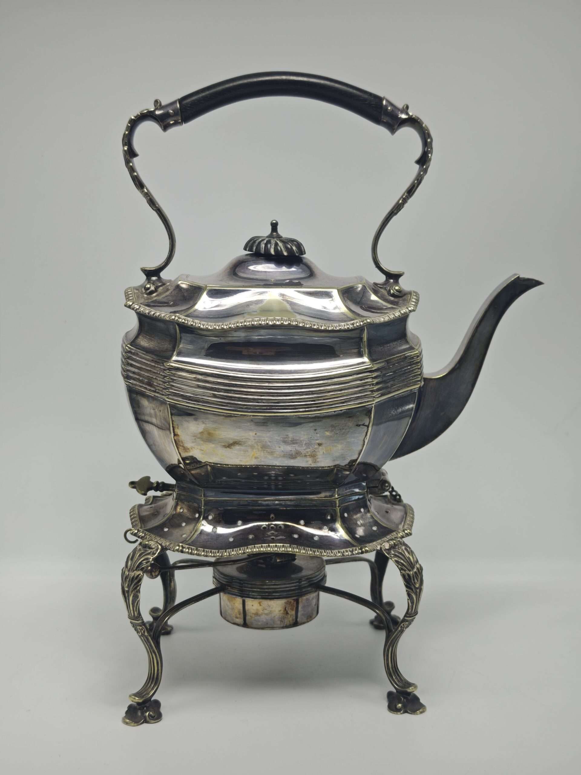 Бульотка на подставке с горелкой, серебрение, патина. Англия 1910-1930 гг.