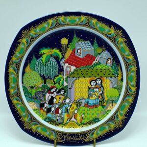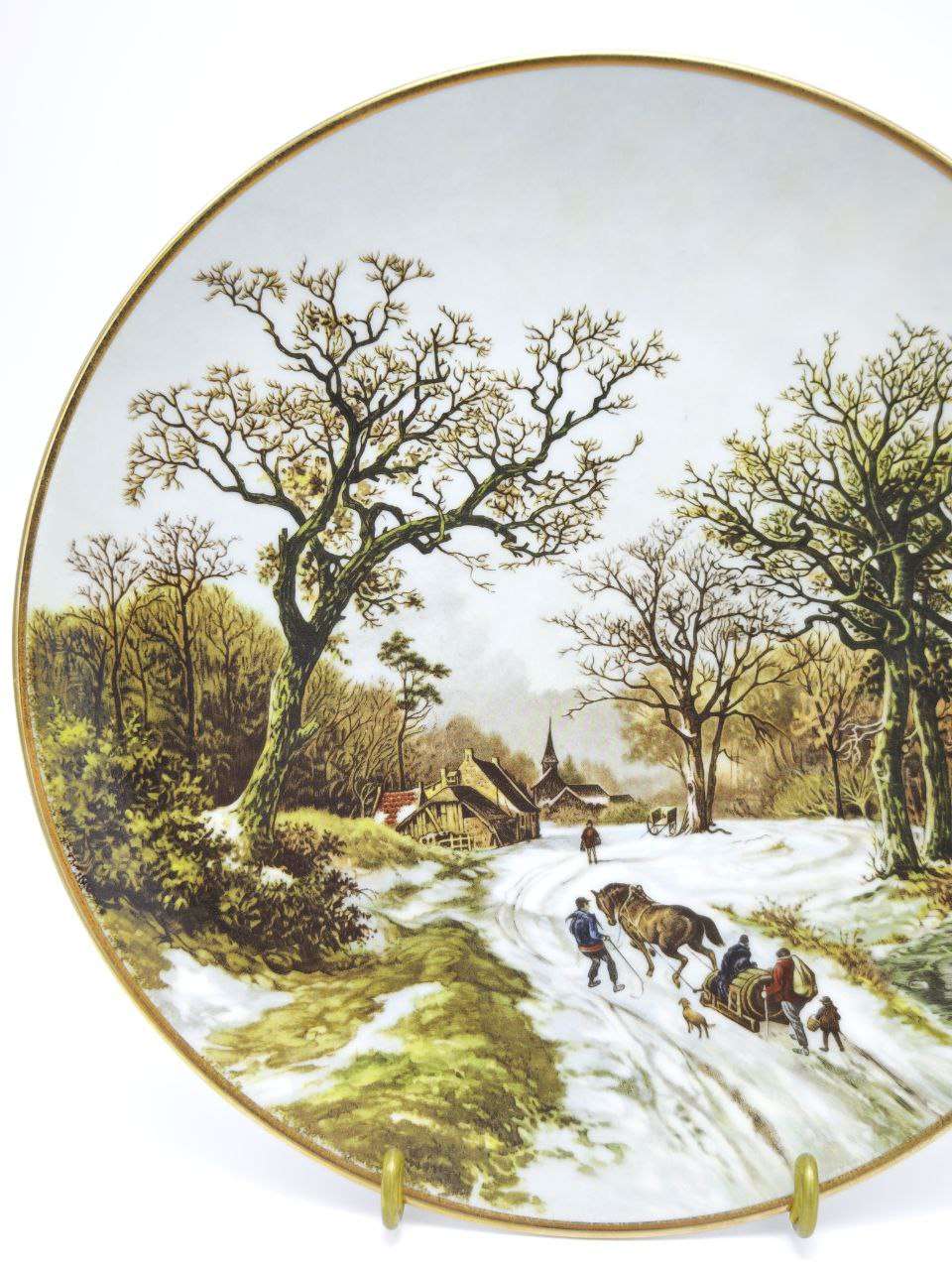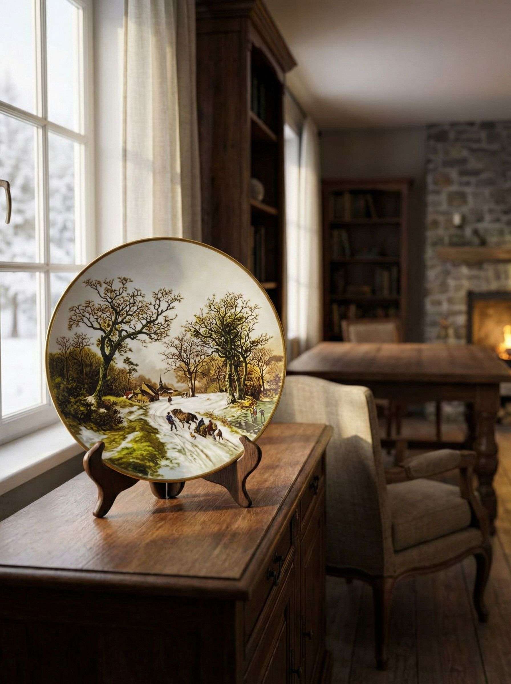 Фарфоровая настенная тарелка с зимним сельским пейзажем выполнена по мотивам картины художника Barend Cornelis Koekkoek. Сюжет передаёт атмосферу зимней дороги с упряжкой, деревьями и деревенскими постройками, характерную для классической европейской живописи XIX века. Тарелка украшена тонким золотистым кантом, который подчёркивает форму и добавляет интерьеру аккуратный декоративный акцент. Диаметр изделия составляет 24 см, тарелка предназначена для настенного размещения или оформления коллекции декоративного фарфора.