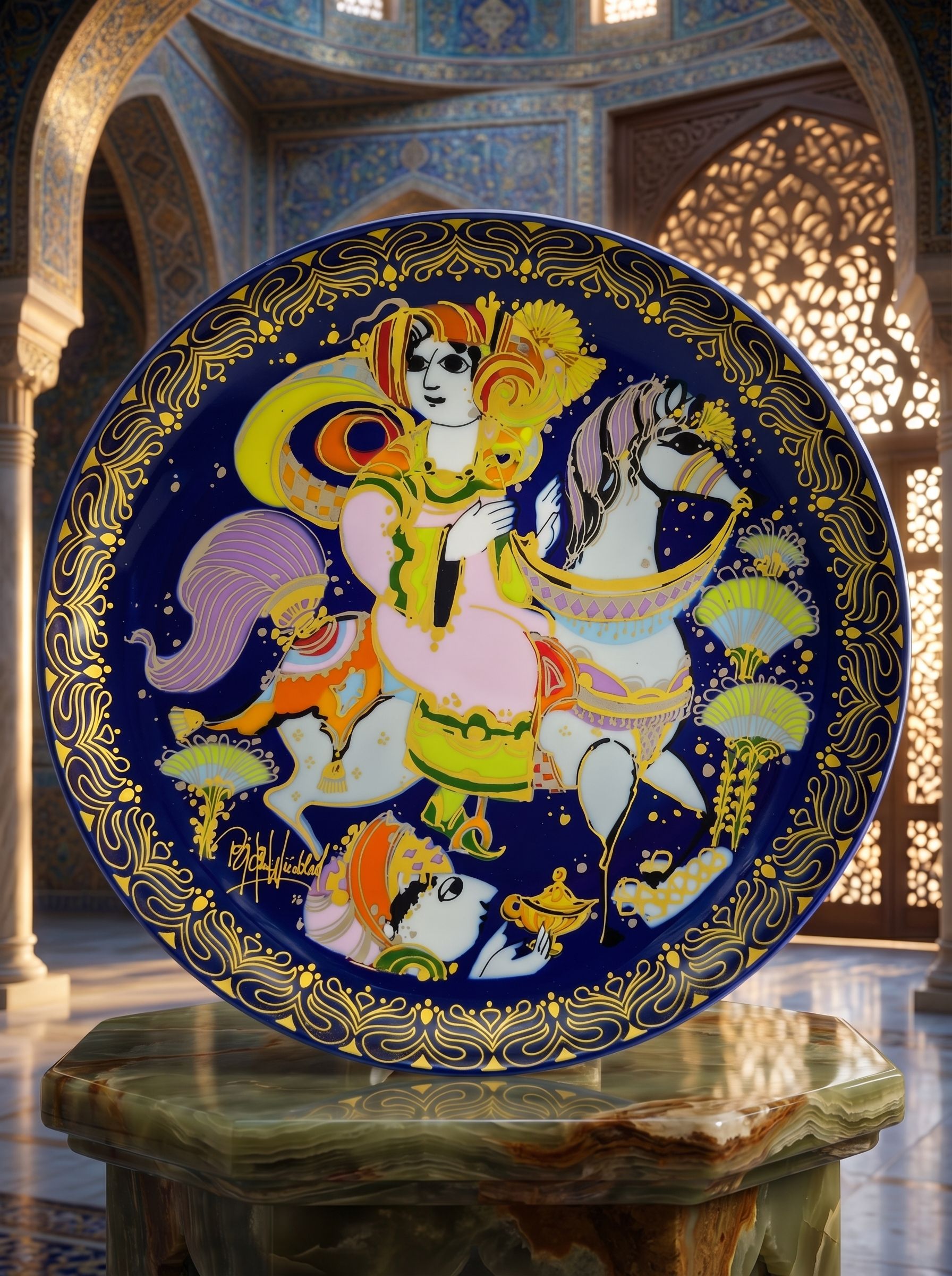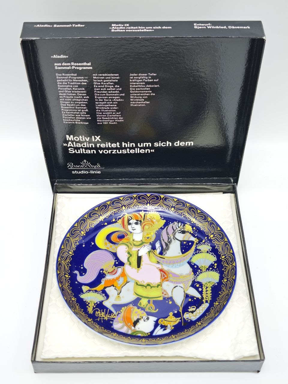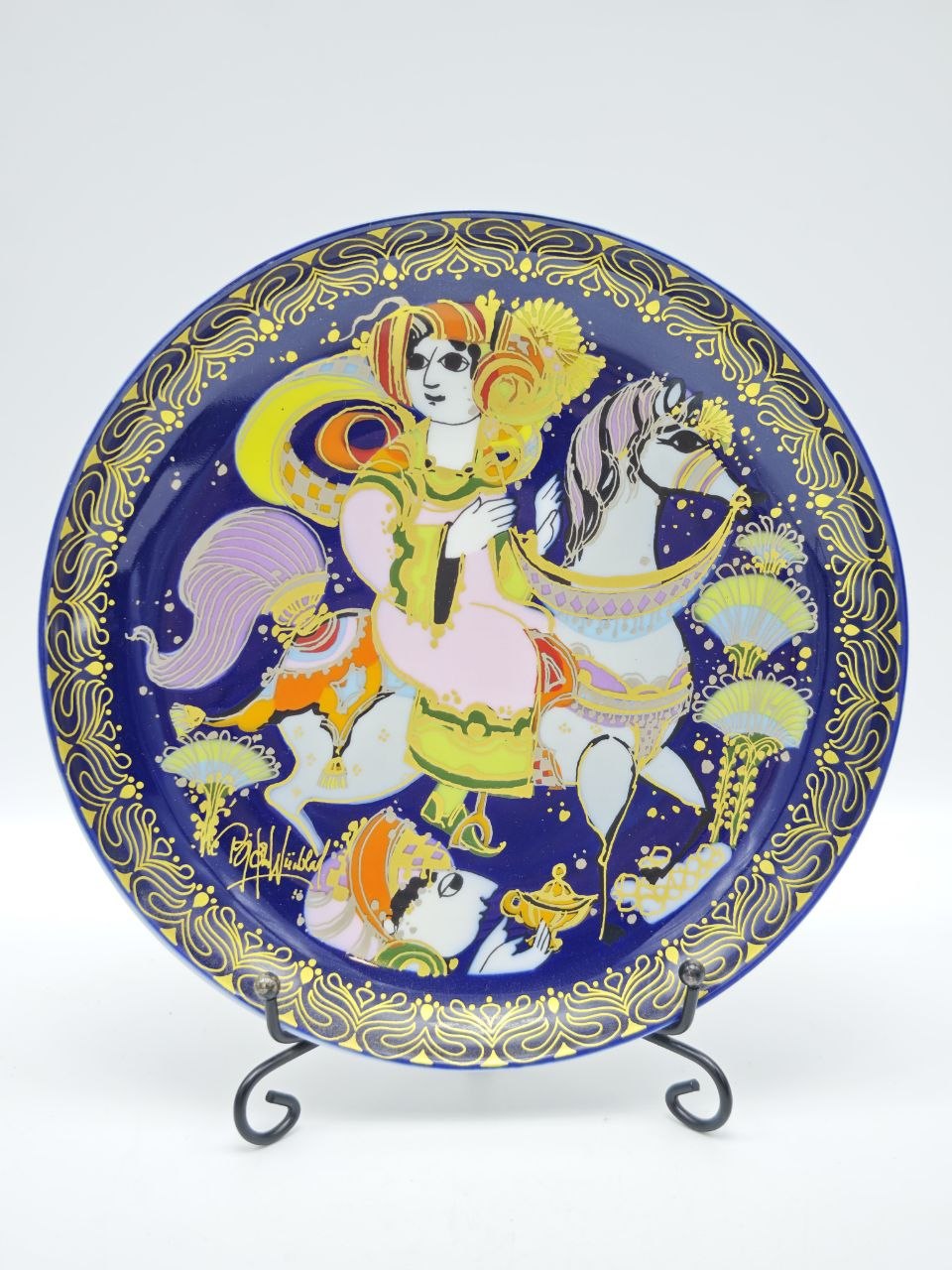 Декоративная тарелка с выразительным сюжетом «Аладдин и волшебная лампа», изображающим движение героя к дворцу султана. Яркая композиция с насыщенным синим фоном и контрастными элементами создаёт ощущение динамики и глубины. Фарфор с позолотой подчёркивает декоративность и изящество изделия, диаметр 16.5 см. Выпуск Rosenthal Studio Line, Германия. Подходит для создания акцентного декора и тематических коллекций.