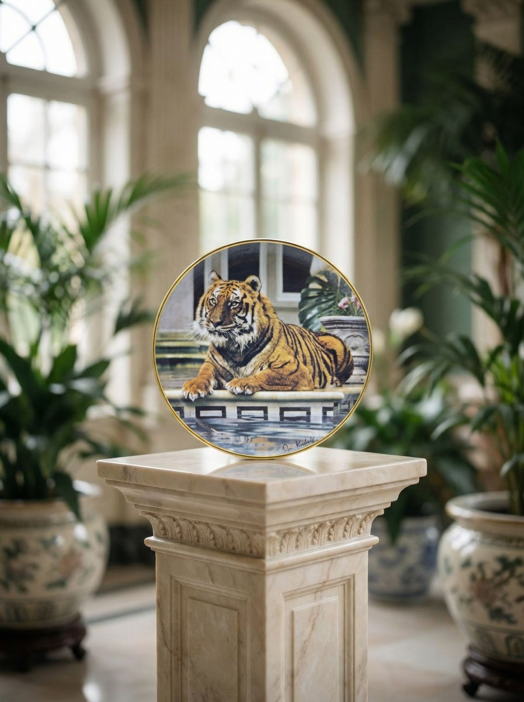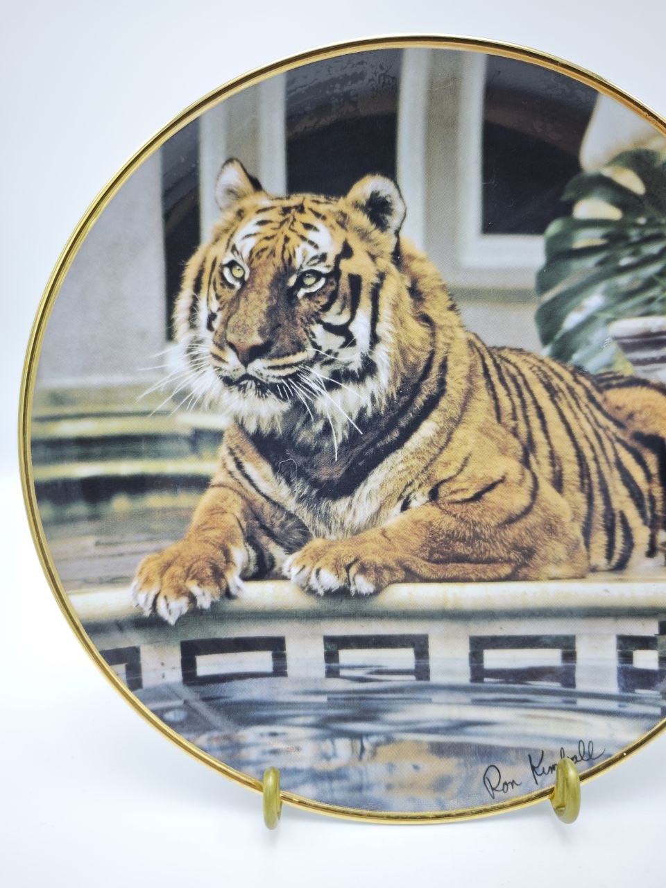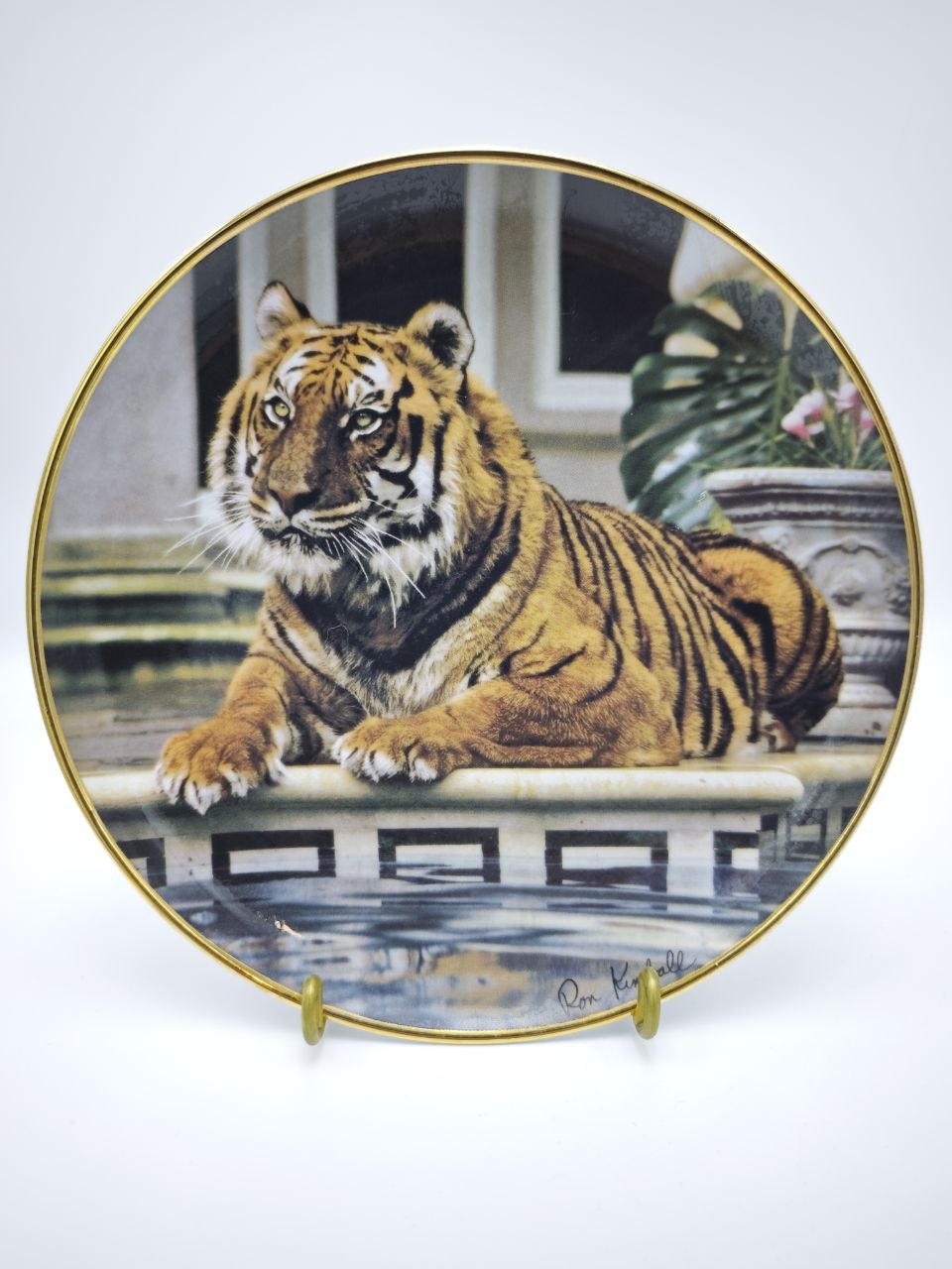 Декоративная коллекционная тарелка The Franklin Mint с работой художника Ron Kimball отражает мощь и спокойствие тигра в изысканном интерьере. Композиция с мягкими отражениями воды и архитектурным фоном создаёт эффект глубины и живописности. Диаметр тарелки 21 см, идеально подходит для настенного декора или размещения в витрине. Изделие выполнено из фарфора с деколью и аккуратным золочением по краю.